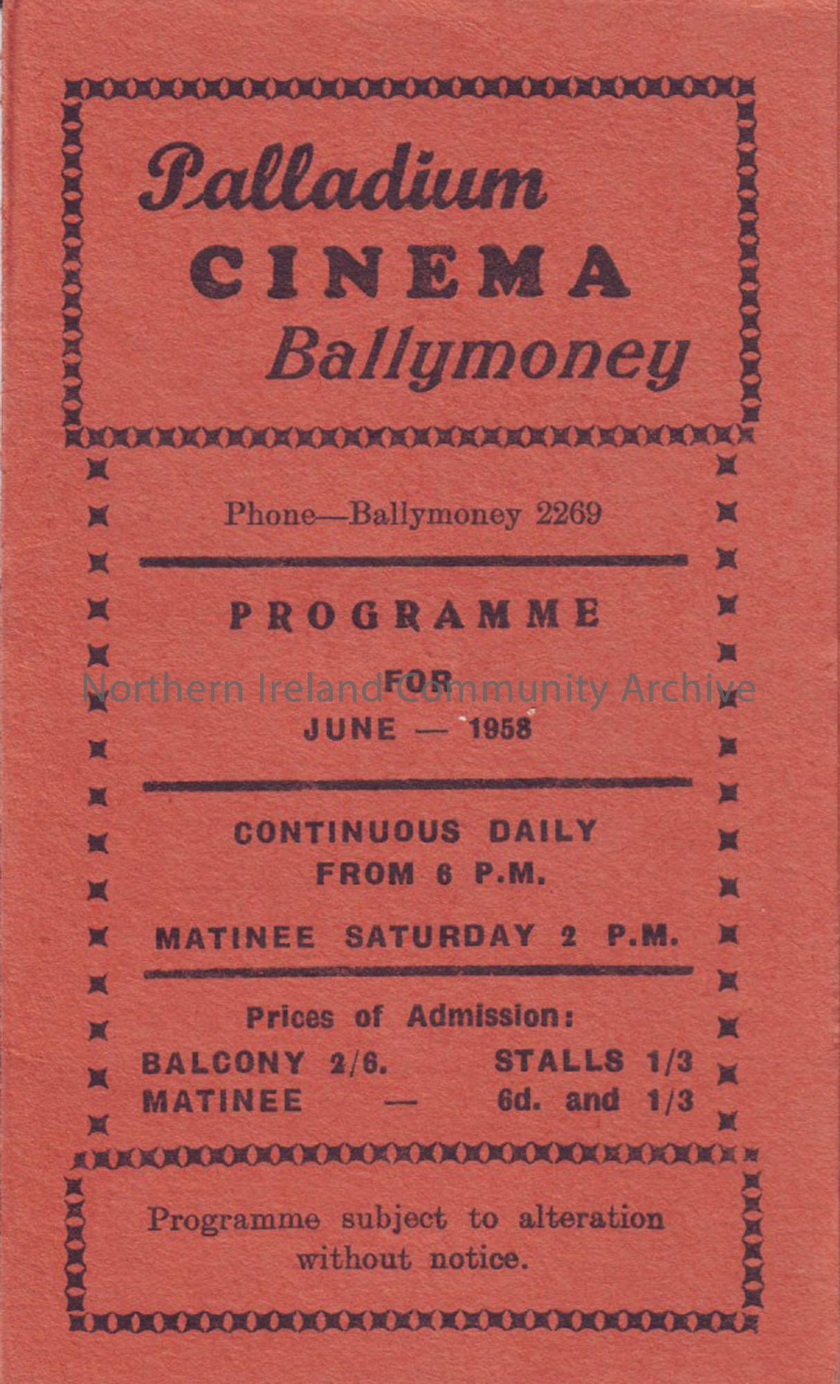 orange monthly programme for Ballymoney Palladium cinema- June 1958