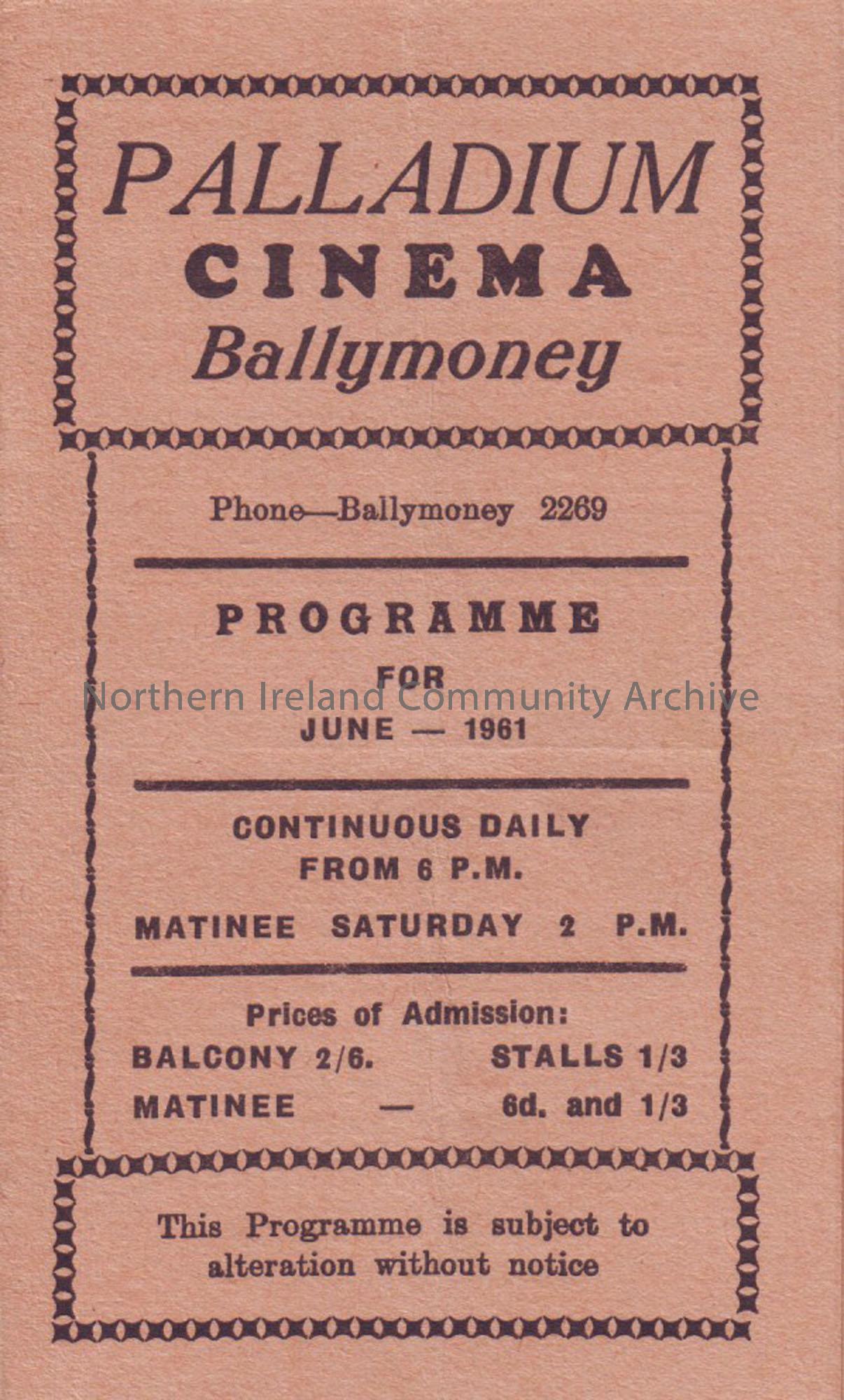 orange monthly programme for Ballymoney Palladium cinema- June 1961