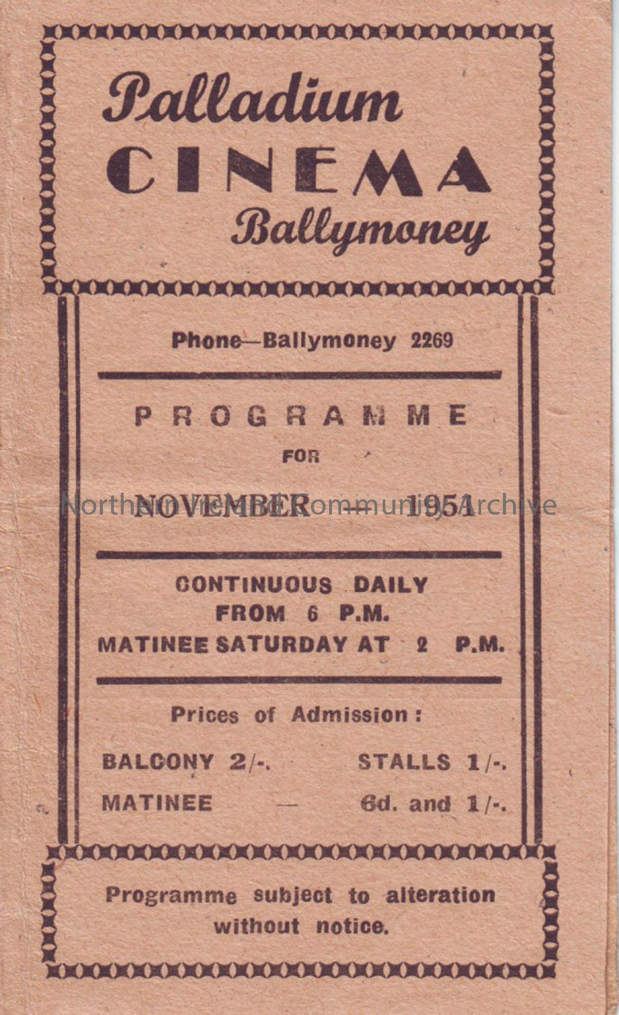 orange monthly programme for Ballymoney Palladium cinema- November 1951