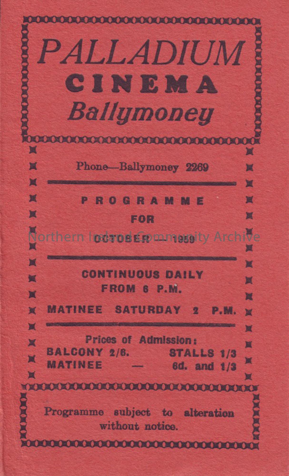 orange monthly programme for Ballymoney Palladium cinema- October 1959