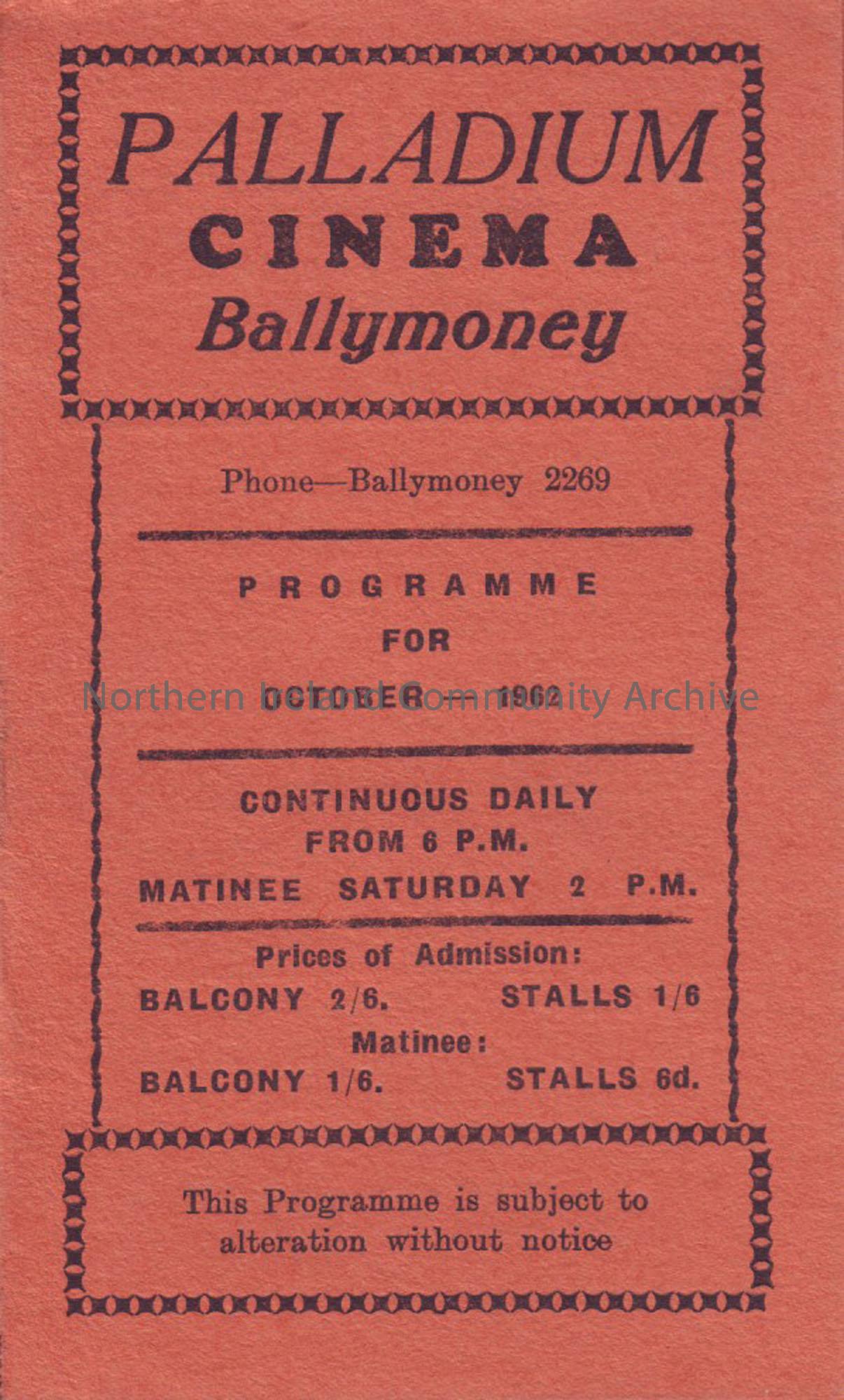orange monthly programme for Ballymoney Palladium cinema- October 1962