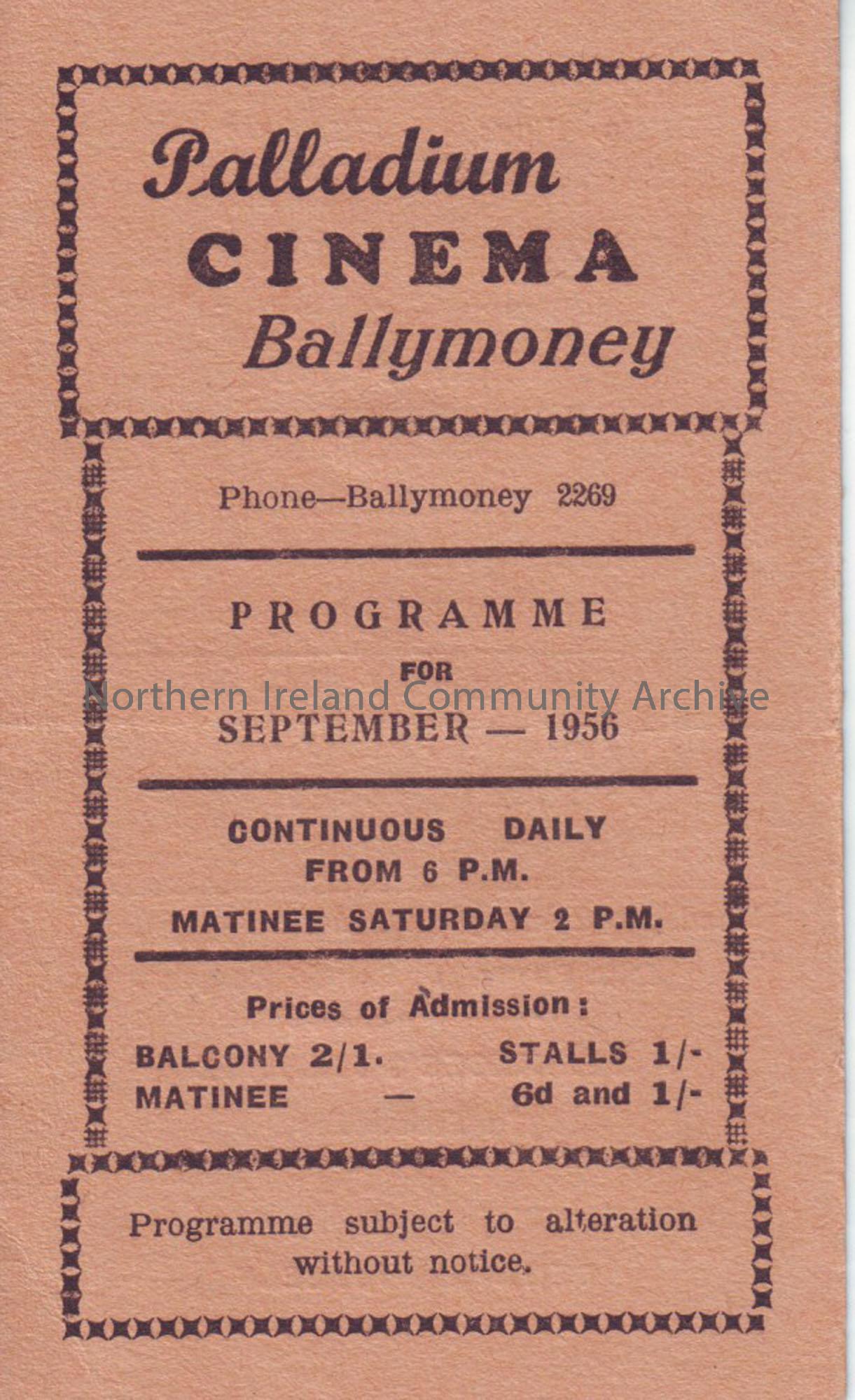 orange monthly programme for Ballymoney Palladium cinema- September 1956