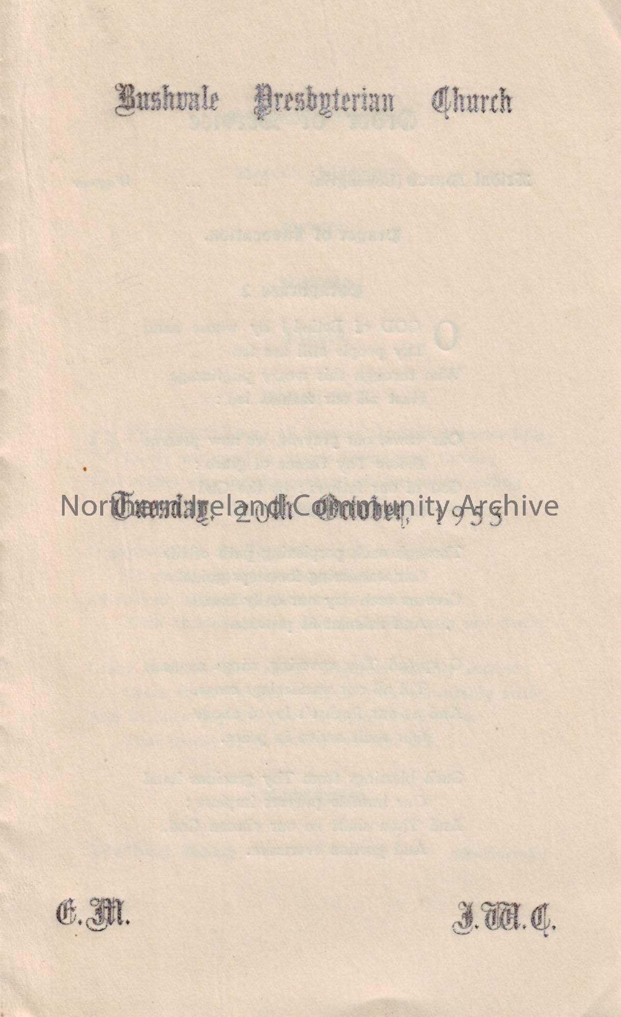 Order of Service of the wedding of Elizabeth Morrison and John Craig at Bushvale Presbyterian Church, Tuesday 20th October, 1953.