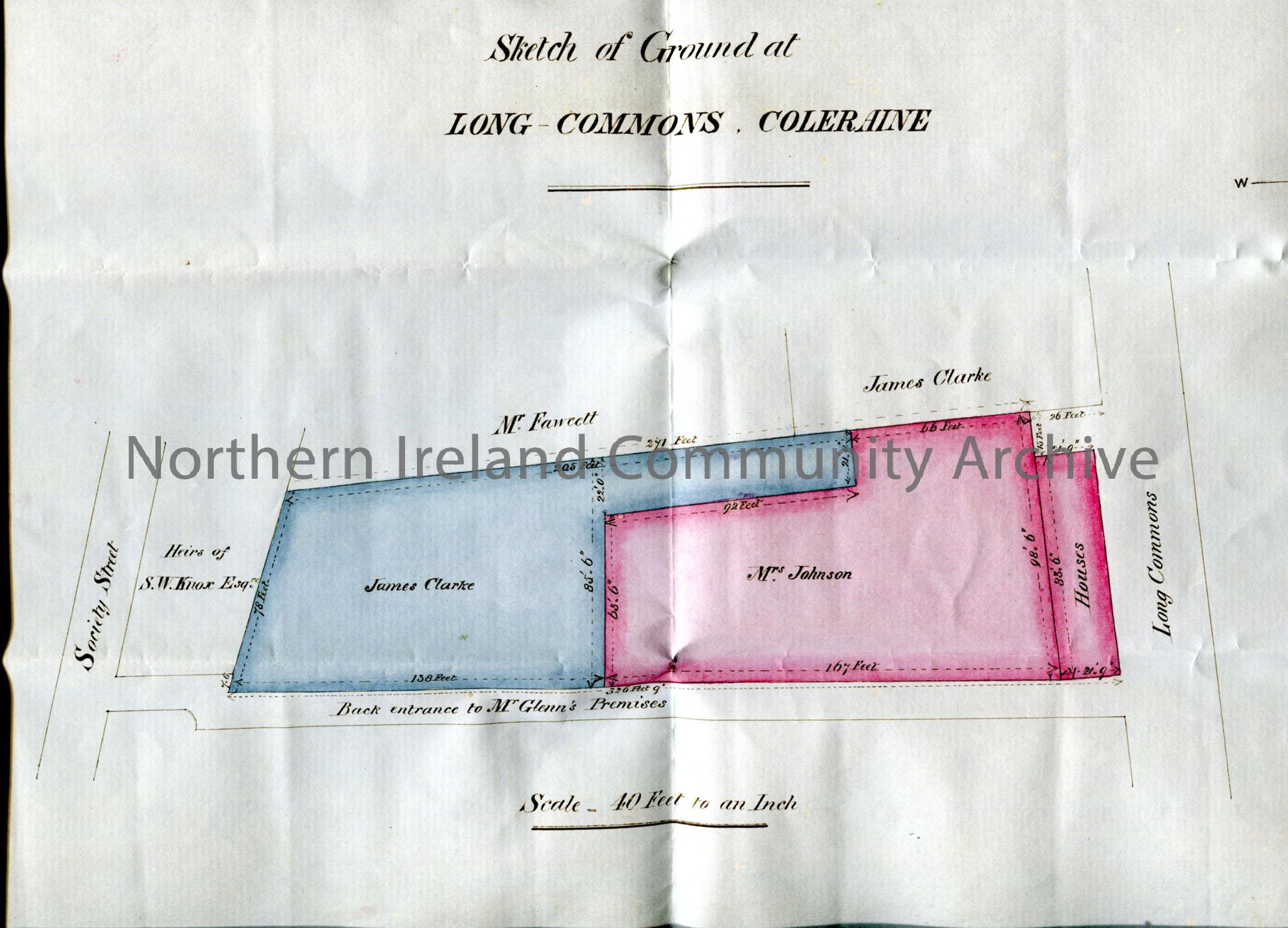 Outline map of plots between Society Street and Long Commons, with names of tenants