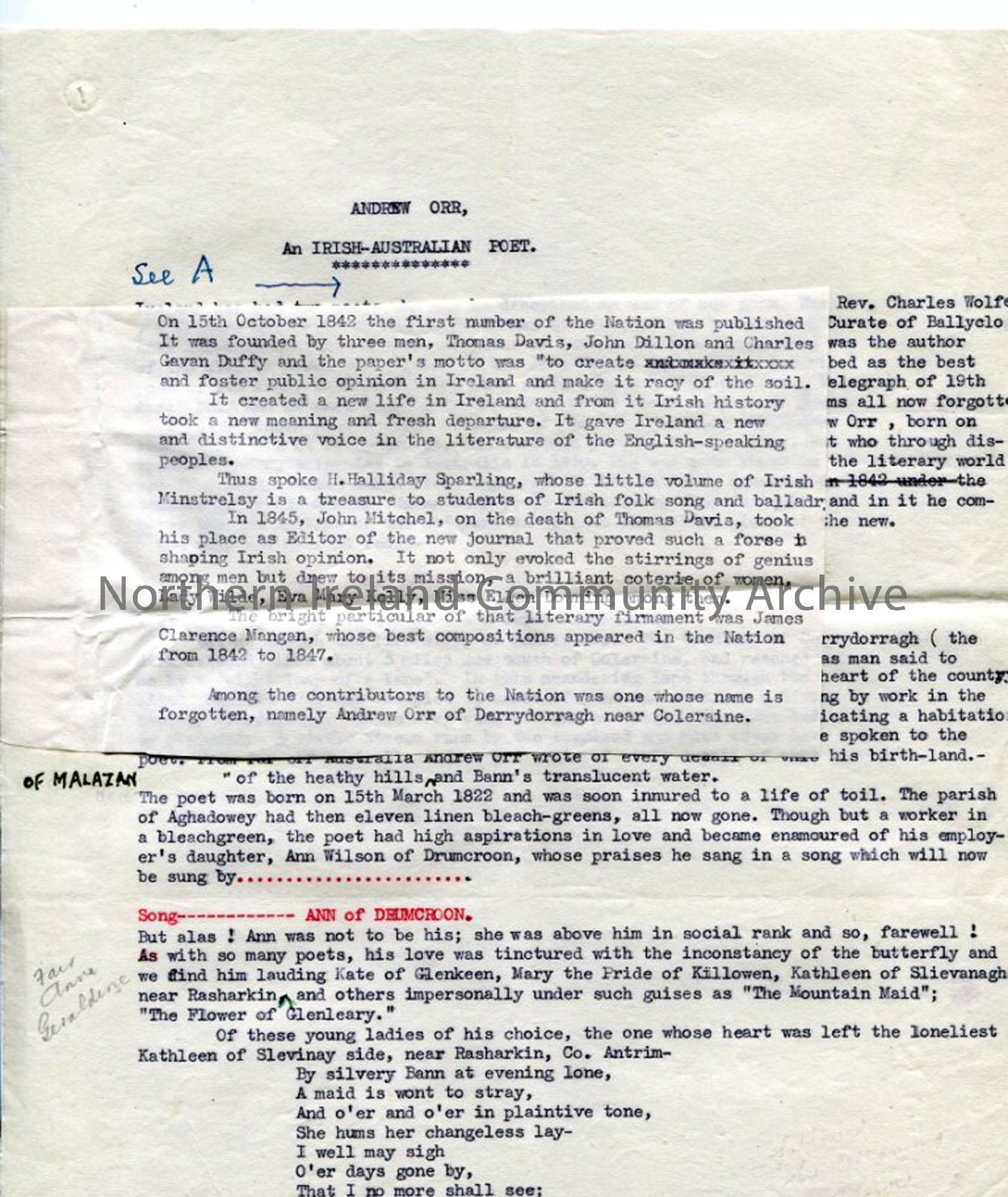 One of 4 pages of what appears to be a broadcast script on Andrew Orr. Includes biographical information on Orr, the Aghadowey area, the linen industry which he worked in, the women he loved (Ann, Mary and especially Kathleen) and mentioned in his poems, the papers he was published in. Notes on 'The Nation' on smaller piece of paper affixed to main page.
