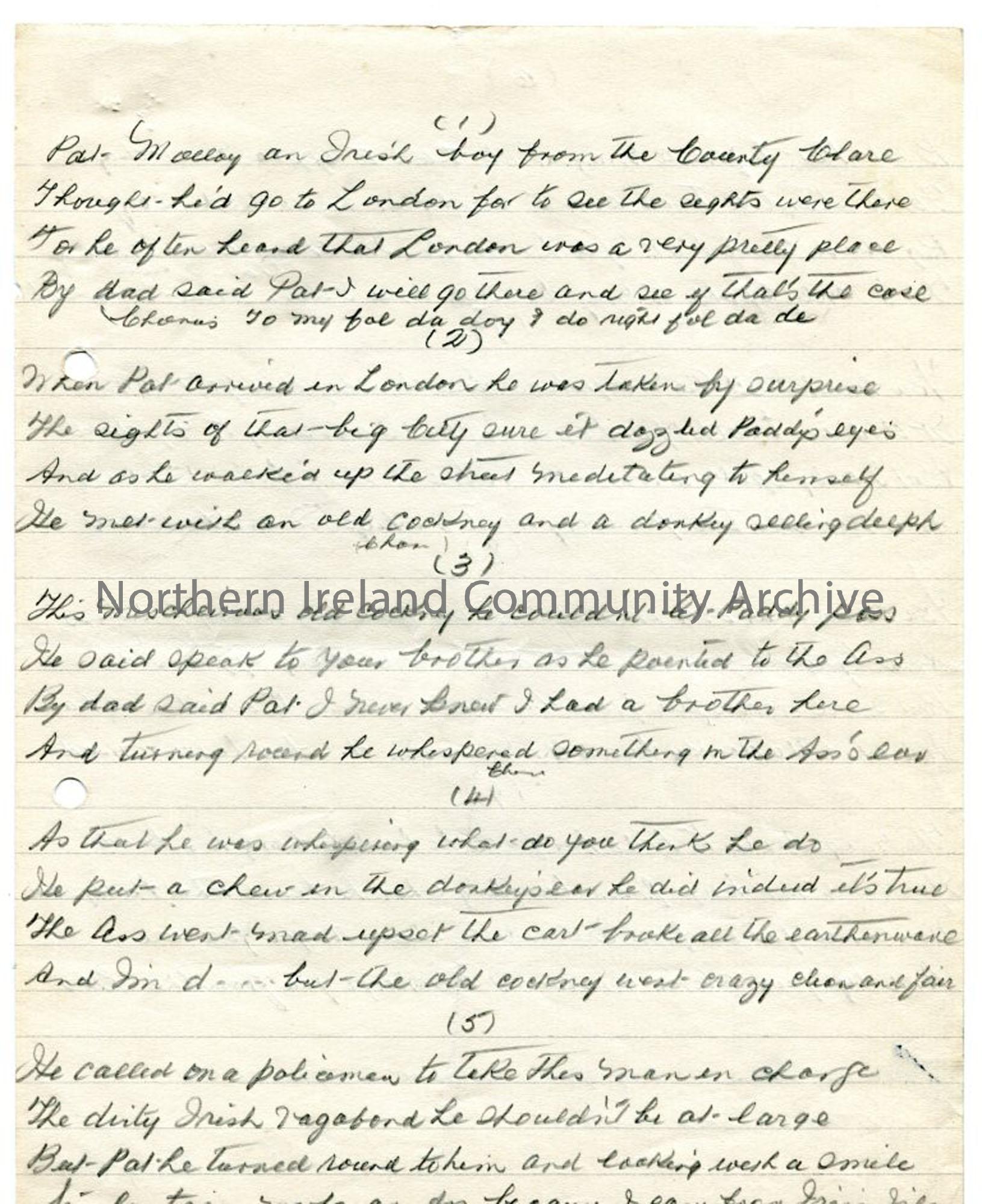 Handwritten untitled song - adventures of Clare man in London. From Dick Gilloway? Learned as a boy from several singers in Magilligan area. Signed simply 'Dick' but same handwriting and presentation style as others donated by Dick Gilloway.