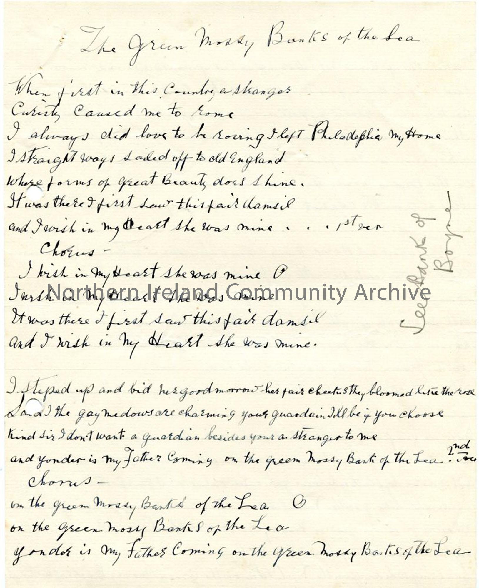 Handwritten words to 'The Green Mossy Banks of the Lea'. Pencilled at side is 'See Banks of Boyne' - words fit that tune.