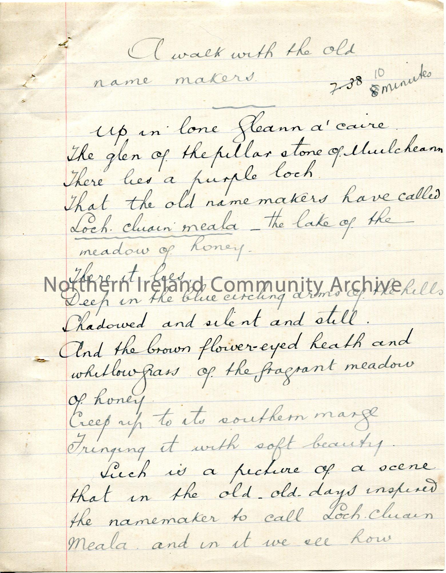 Page 1 of 10. Handwritten notes titled, ‘A Walk with the Old Name Makers’. ‘7.38 10 minutes’ handwritten and scored out on front page. Covers Irish pl…