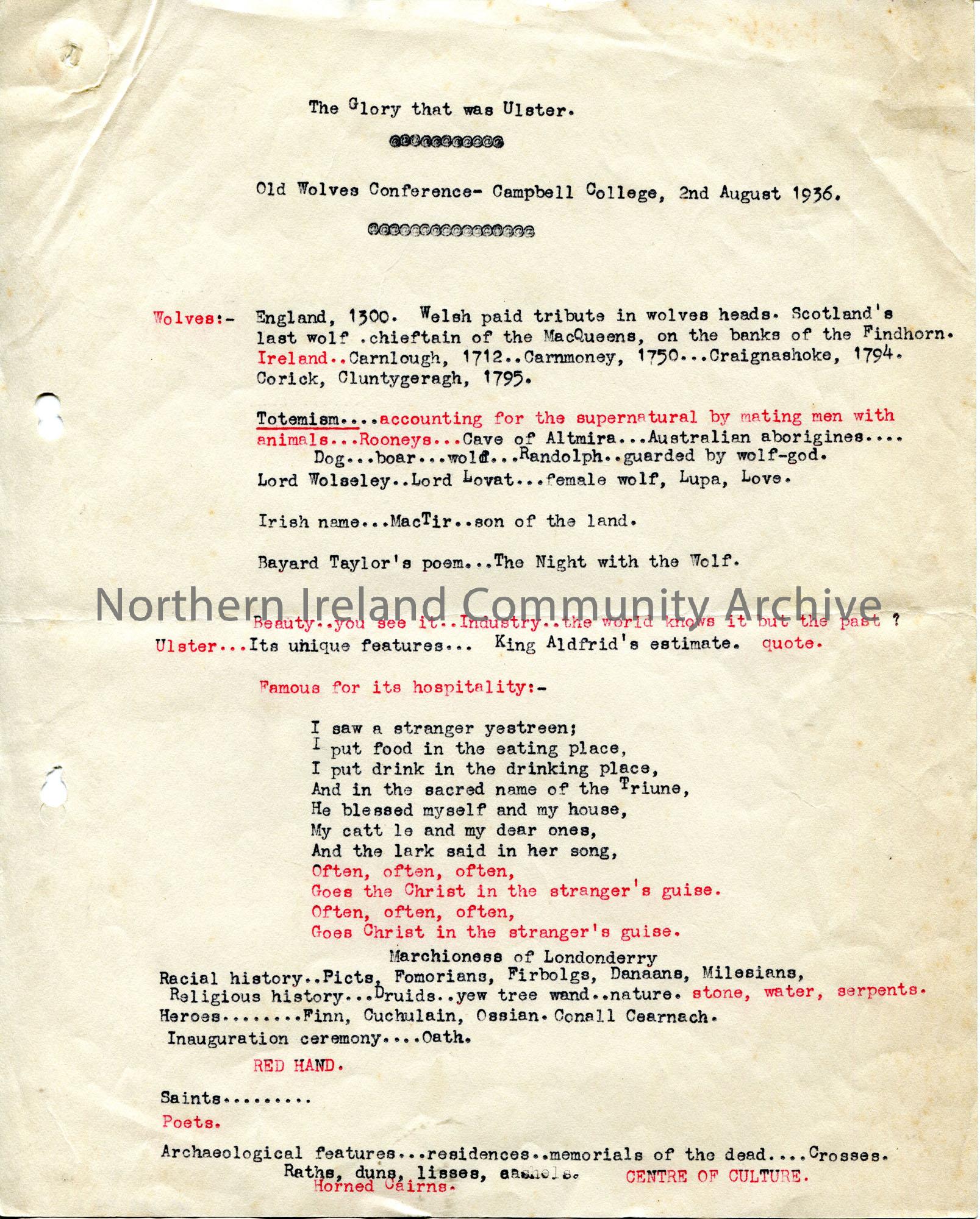 Page 1 of 10. Typed notes for lecture 'The Glory that was Ulster' given by Sam Henry at an 'Old Wolves Conference - Campbell College' on 2nd August 1936.