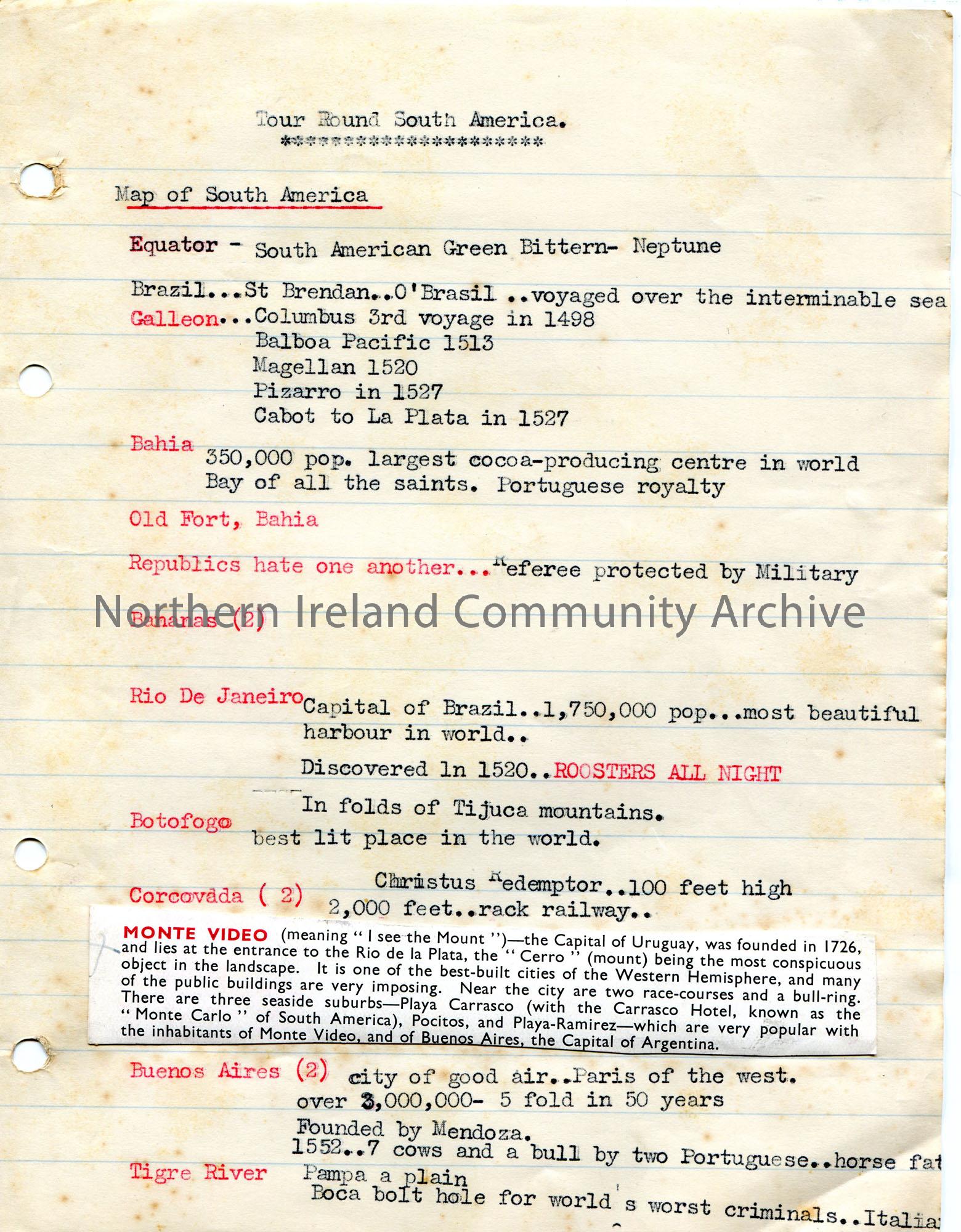 Page 1 of 12. Typed notes on lined paper titled, 'Tour Round South America'. List of locations from a map of South America. Cutting pasted to paper re Monte Video.