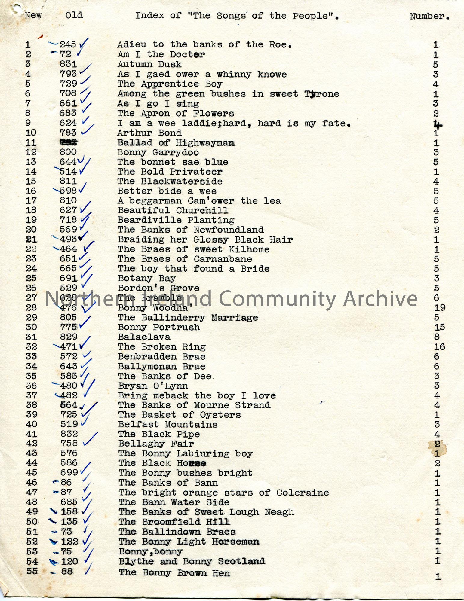 Page 1 of 19. Typed list of songs and song numbers titled, ‘Index of “The Songs of the People”‘. Some song numbers are ticked with blue Biro pen.