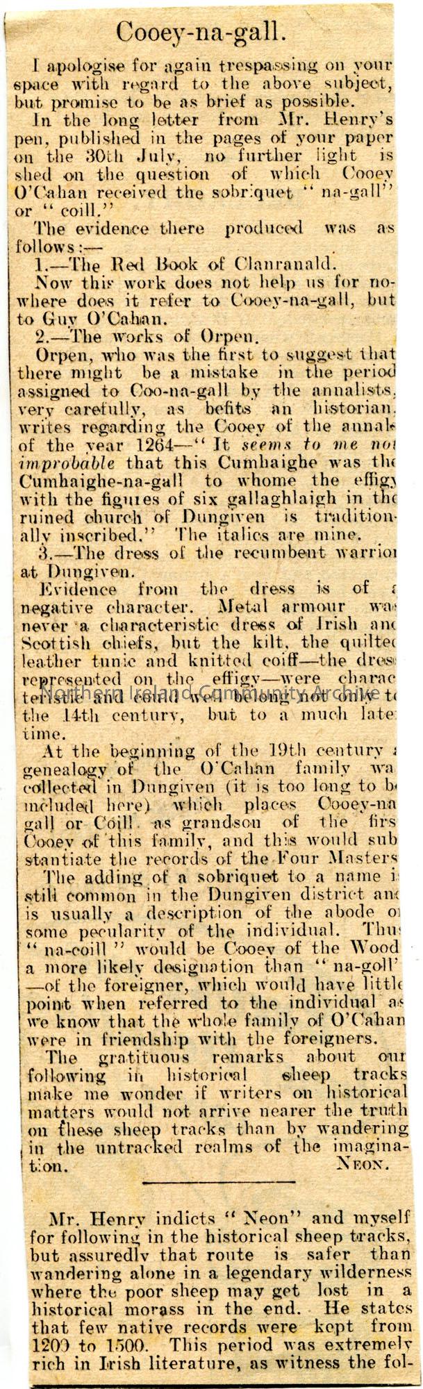 Page 1 of 2. Article cut from a newspaper. Article titled, 'Cooey-na-gall'. The article consists of two letters sent into the newspaper from 'Neon' and 'Dalriada' who dispute Sam Henry's article re Cooey-na-gall.