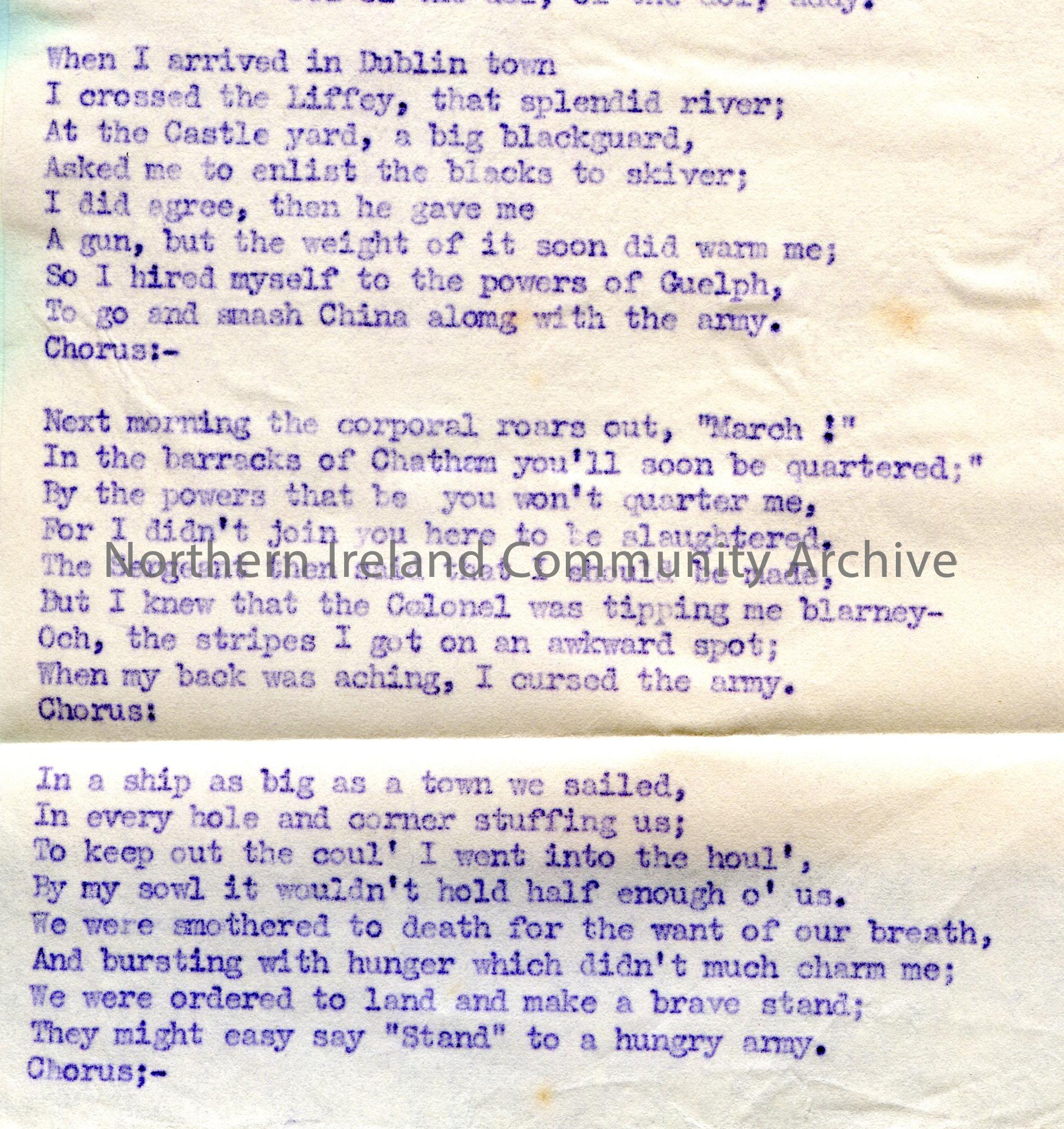 Page 1 of 2. Carbon copy of a typed tonic sol-fa notation and words to song titled, 'No. 92 - The Hungry Army'. Taken down from Mr Hamilton Hemingway, ex-constable R.I.C., who learnt it from Corporal John Doyle of the Kildare Rifles, 1885. Doyle learnt it from John Bailey,shoemaker in the Bog of Allen and an old soldier of the 'Third Buffs'. The hero of the song was evidently in the Marine Artillery.