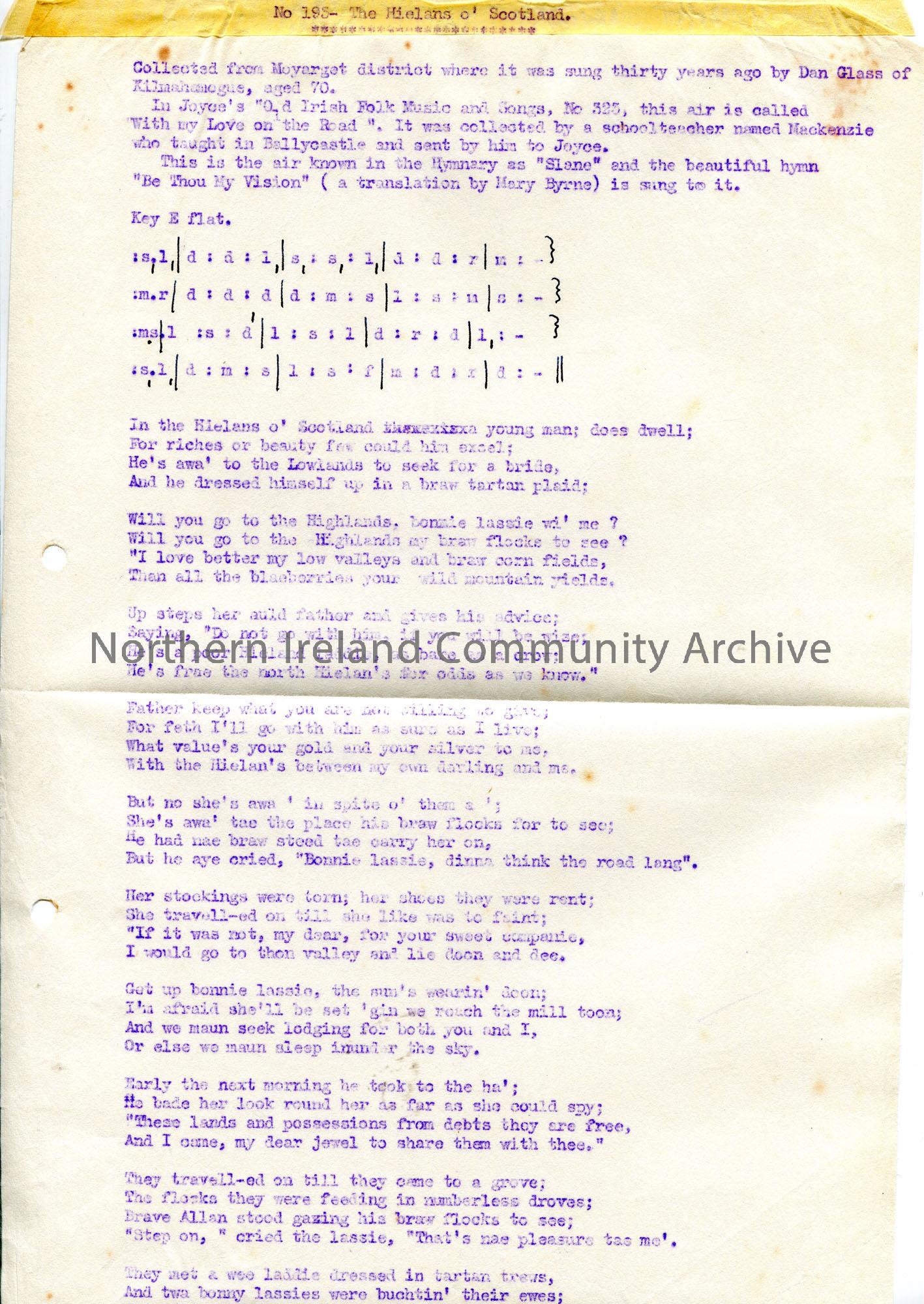 Page 1 of 2. Carbon copy of typed tonic sol-fa notation and words to song titled, 'No. 193 - The Hielans O' Scotland'. Collected from the Moyarget district, previously sung by Dan Glass of Kilmahamogue.