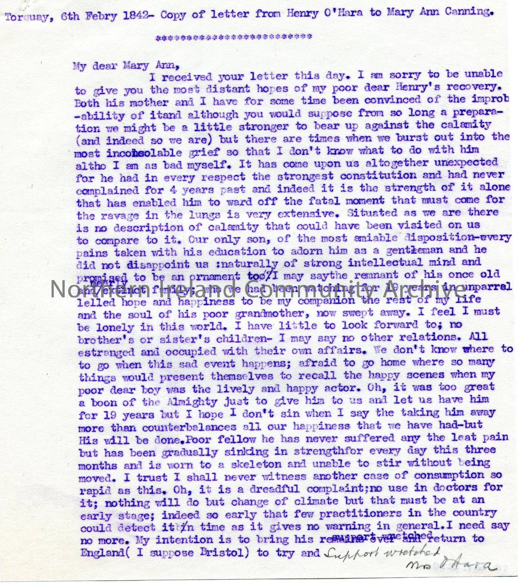 Page 1 of 2. Copy of a letter transcribed by Sam Henry. To ‘My dear Mary Anne’ [Canning]. Writes in a sorrowful tone of his dying son.