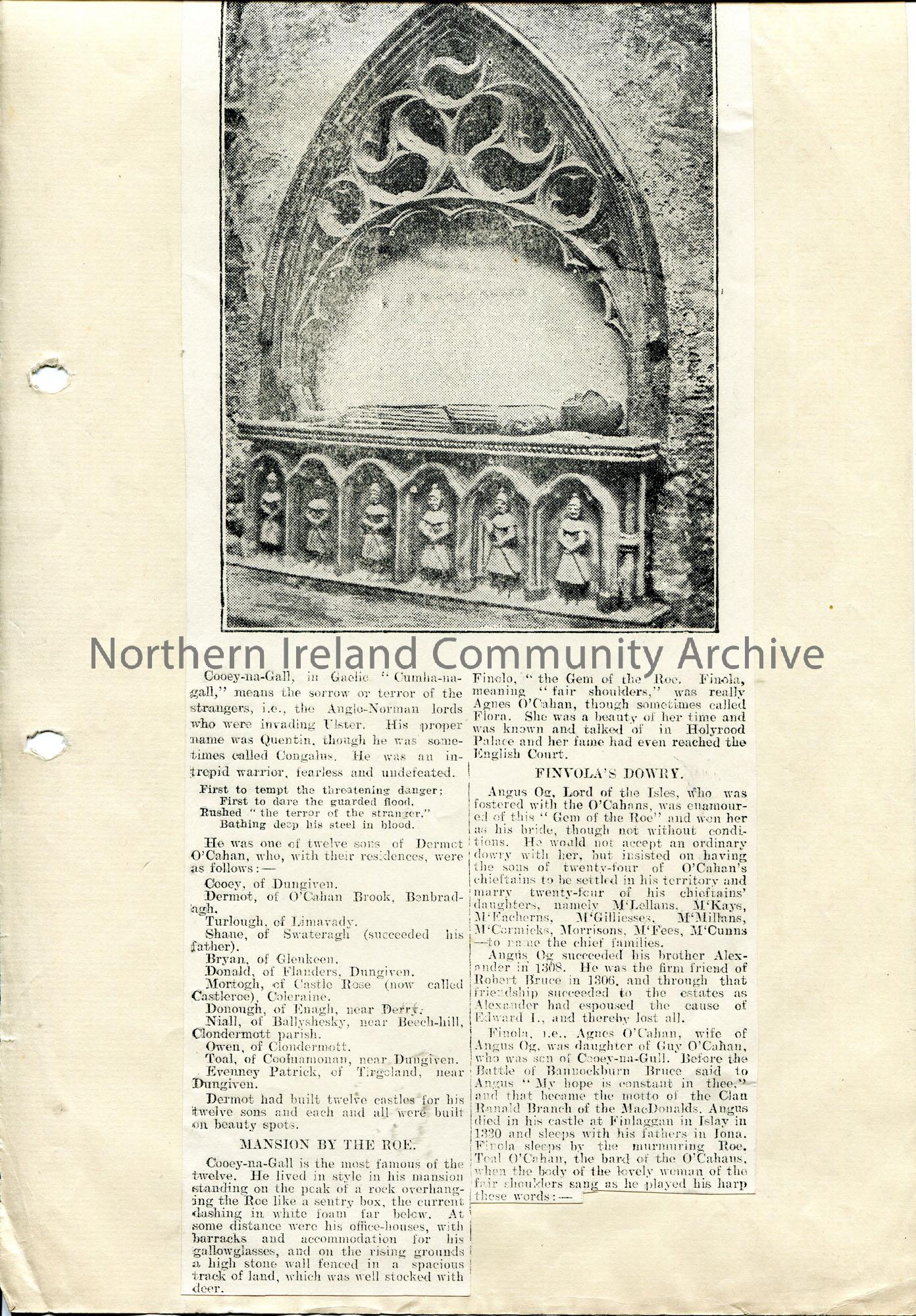 Page 1 of 2. Copy of an article with photographic image titled, 'No. 22. - Cooey-Na-Gall's Tomb, Dungiven Priory Church'. Photograph is of the tomb itself. Re Cooey-na-Gall - warrior and one of twelve sons on Dermot O'Cahan - and Finvola / Finola 'Gem of the Roe'.