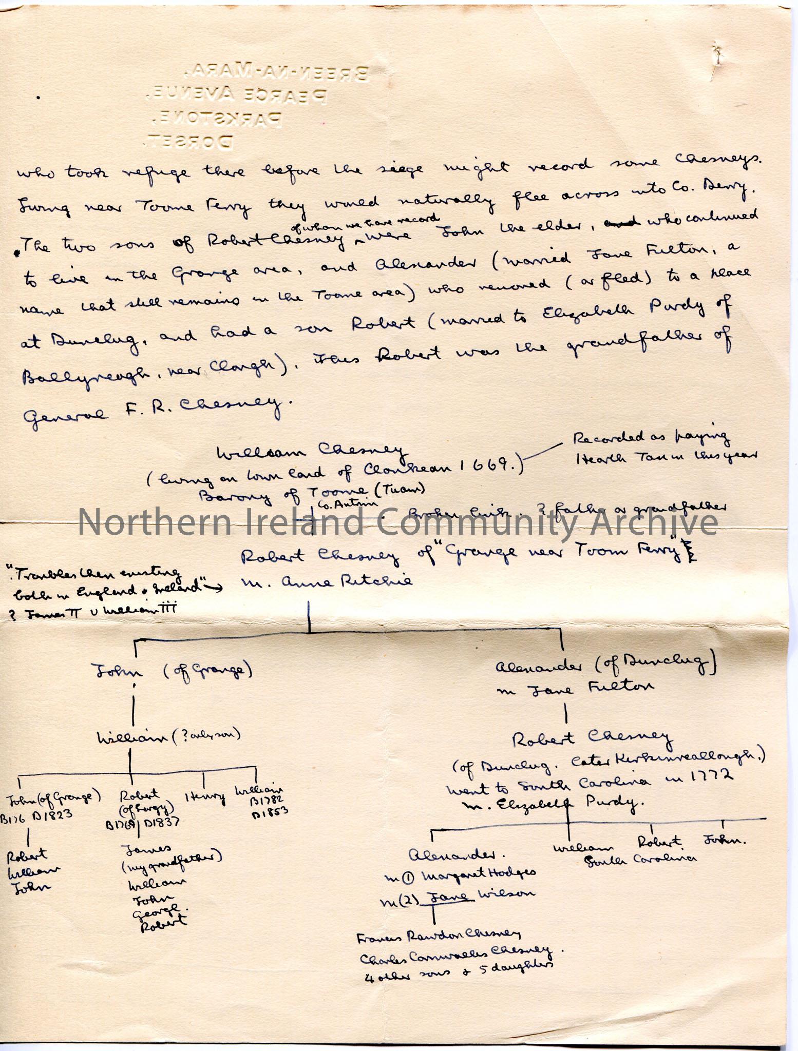 Page 1 of 2. Double sided. Handwritten letter. From George Chesney to Sam Henry. Dated 28th October, 1935. Apologises to Sam for late reply. Answers Sam's questions re genealogy and history of Chesney family. Would like to hear from Sam if he comes across any new information re Chesney family. Intends to go to Derry when next in Ireland to obtain names of Chesney's who sought refuge there in 1688-1689. Includes diagram of Chesney family tree.