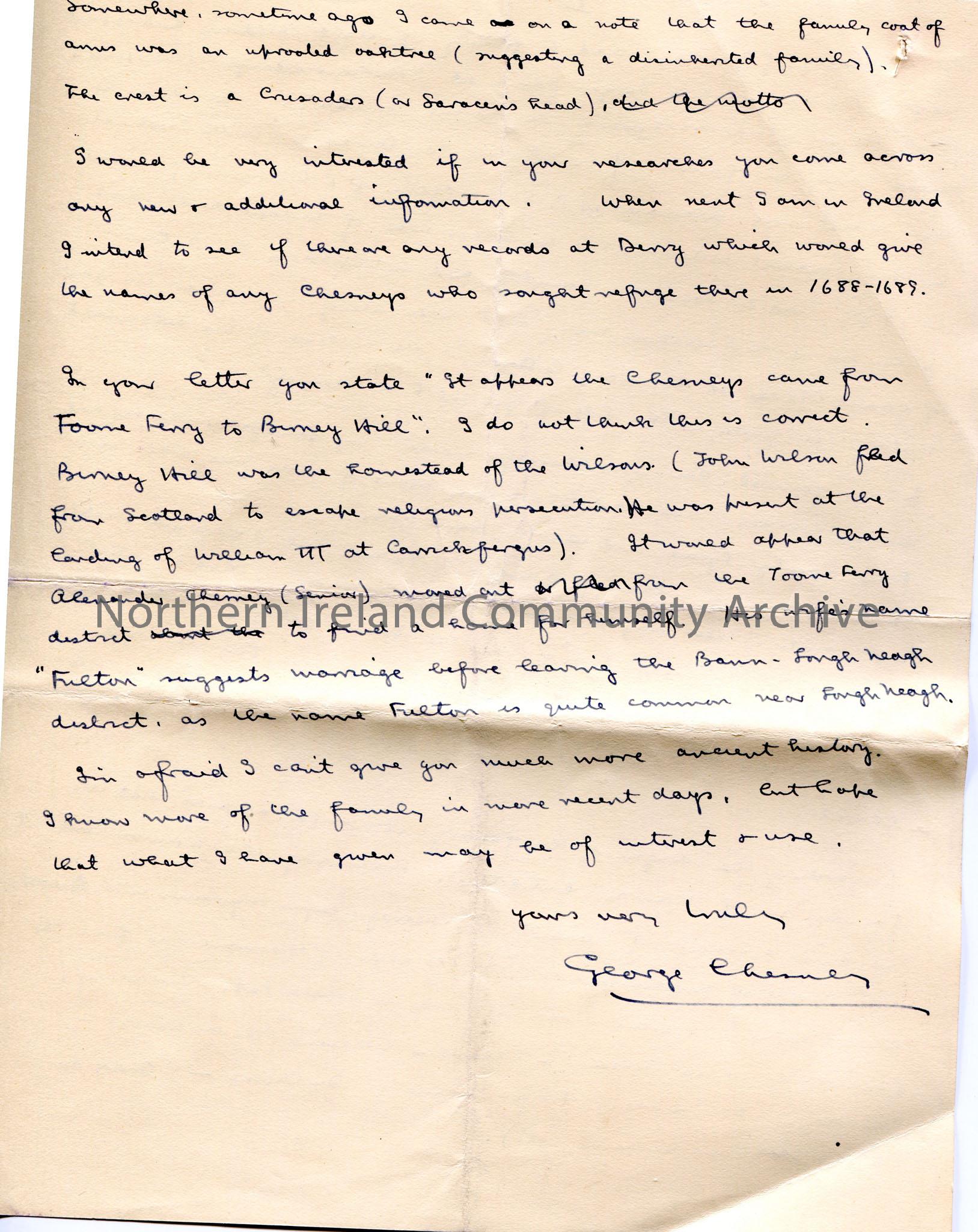 Page 1 of 2. Double sided. Handwritten letter. From George Chesney to Sam Henry. Dated 28th October, 1935. Apologises to Sam for late reply. Answers Sam's questions re genealogy and history of Chesney family. Would like to hear from Sam if he comes across any new information re Chesney family. Intends to go to Derry when next in Ireland to obtain names of Chesney's who sought refuge there in 1688-1689. Includes diagram of Chesney family tree.