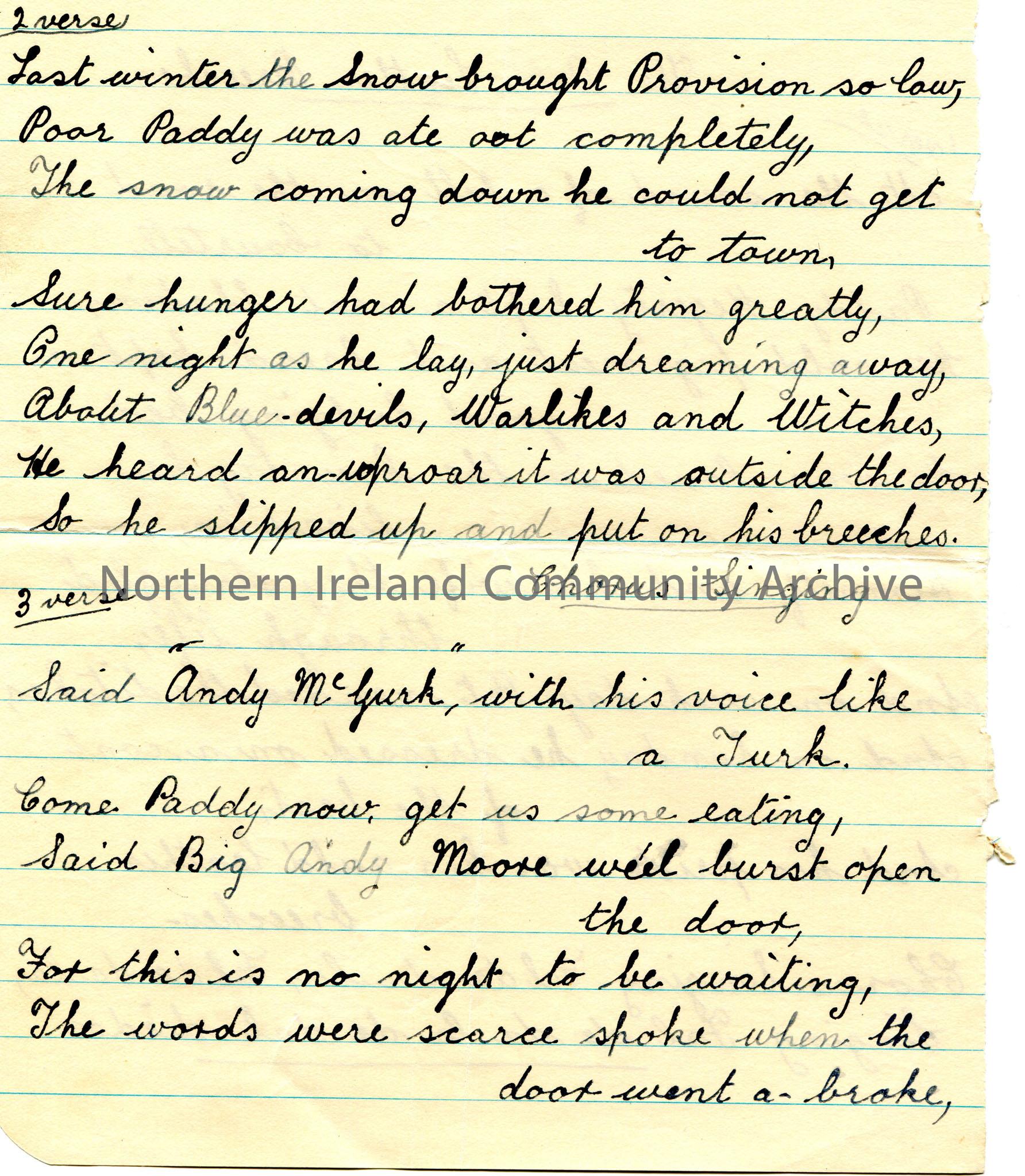 Page 1 of 2, double sided, of handwritten humorous song. Six verses. Titled, ‘The Auld Leather Breeches’. From James Bond, Termaquin, Limavady. Dated … – scan050b