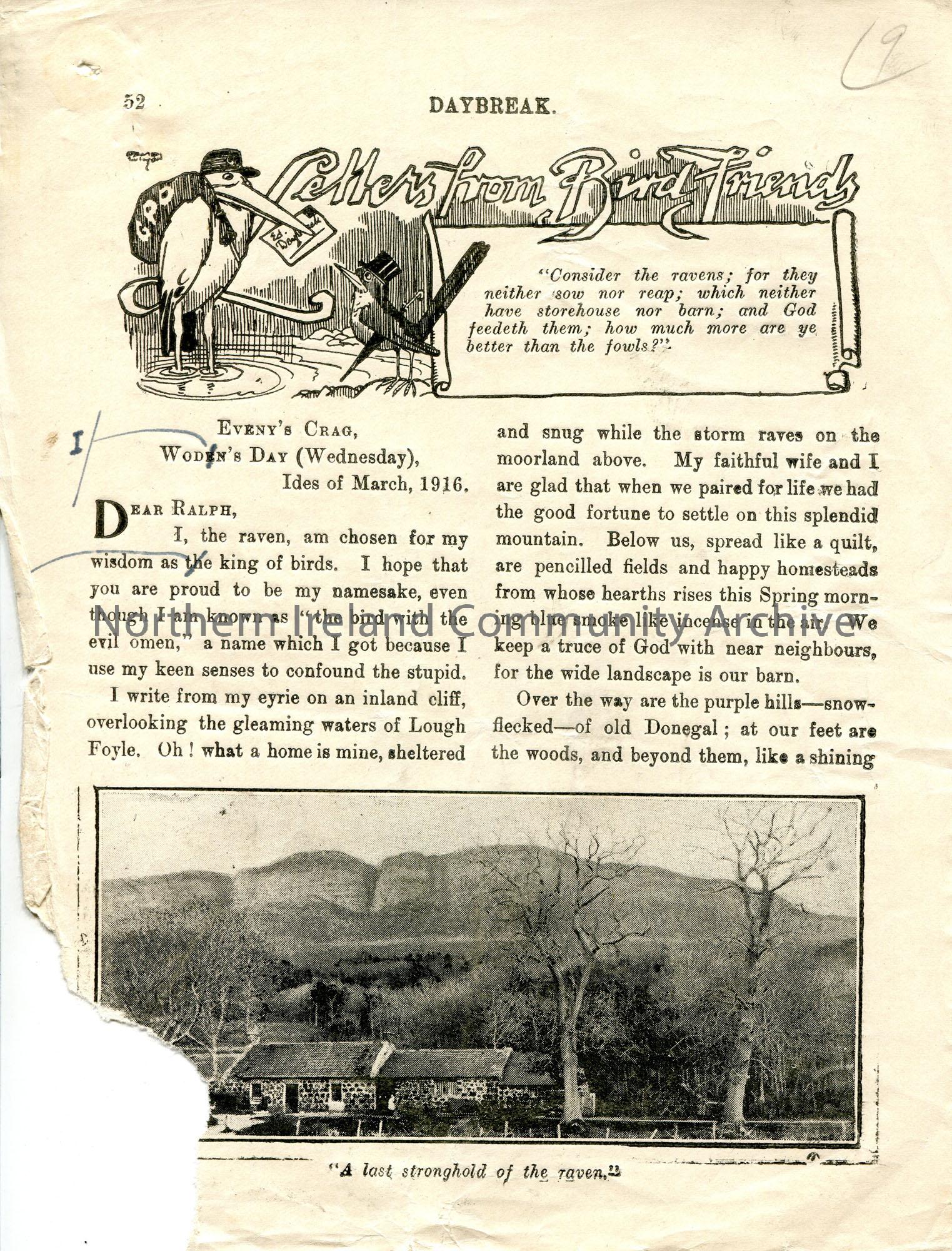 Page 1 of 2. Draft pages for a publication of an article titled 'Letters from Bird Friends' for 'Daybreak'. Written for children from the viewpoint of a raven by Sam Henry. March, 1916. Features a photographic image of Binevenagh mountain captioned, 'A last stronghold of the raven'. Page annotated with changes.