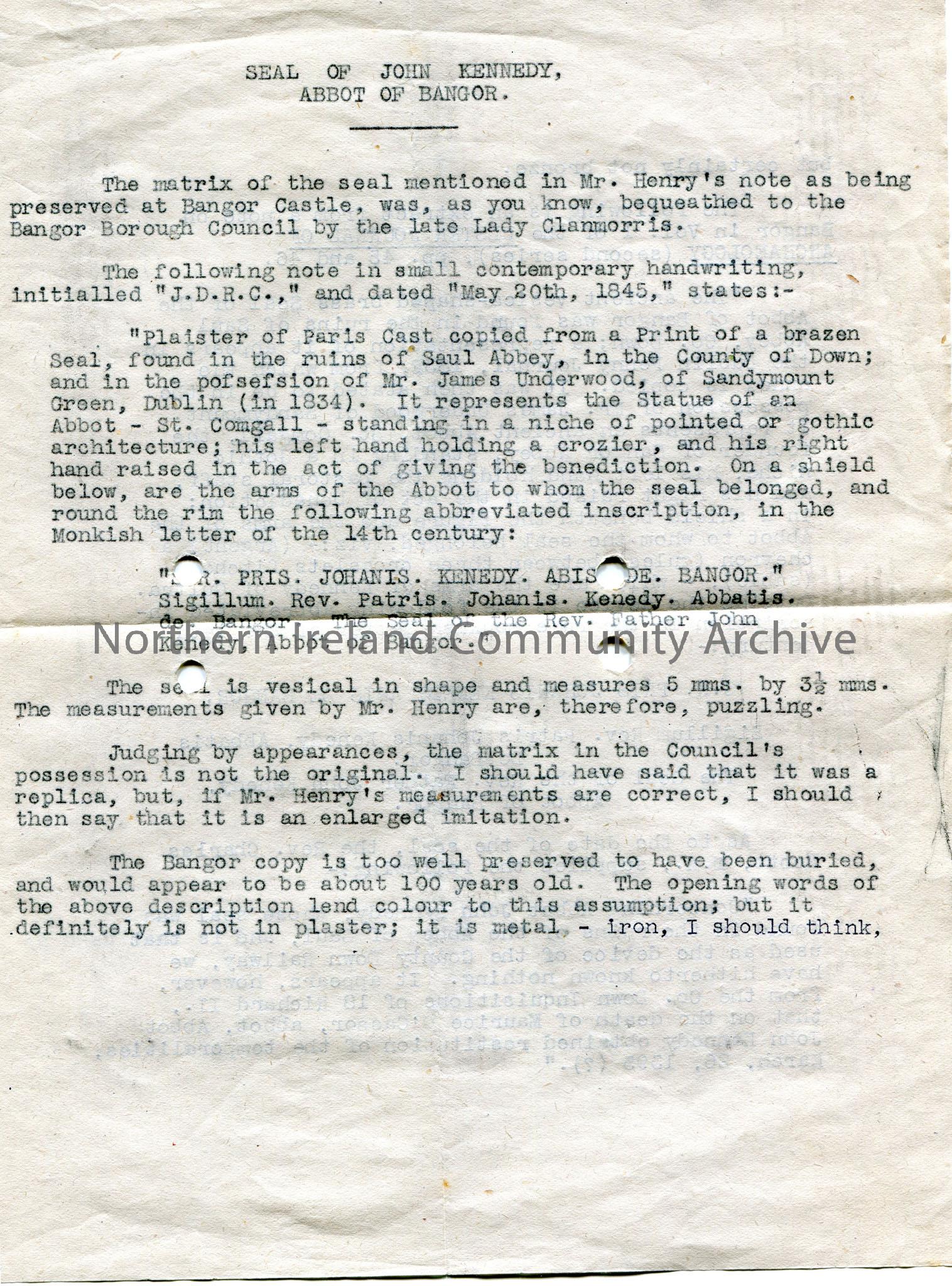 Page 1 of 2. First page double sided. Typed document titled, "Seal of John Kennedy. Abbot of Bangor". By T.B Graham. Dated 9th November, 1943. Re Bangor seal. Discusses the originality of the seal held at Bangor Castle Includes note from J.D.R.C, dated 20th May, 1845, which describes the seal and its representation. Extract from Ulster Journal of Archaeology which states the seal was once in possession of Mr James Underwood of Sandymount. States note from Thomas Drew, Pres. R.S.A. Illustratration of the seal.