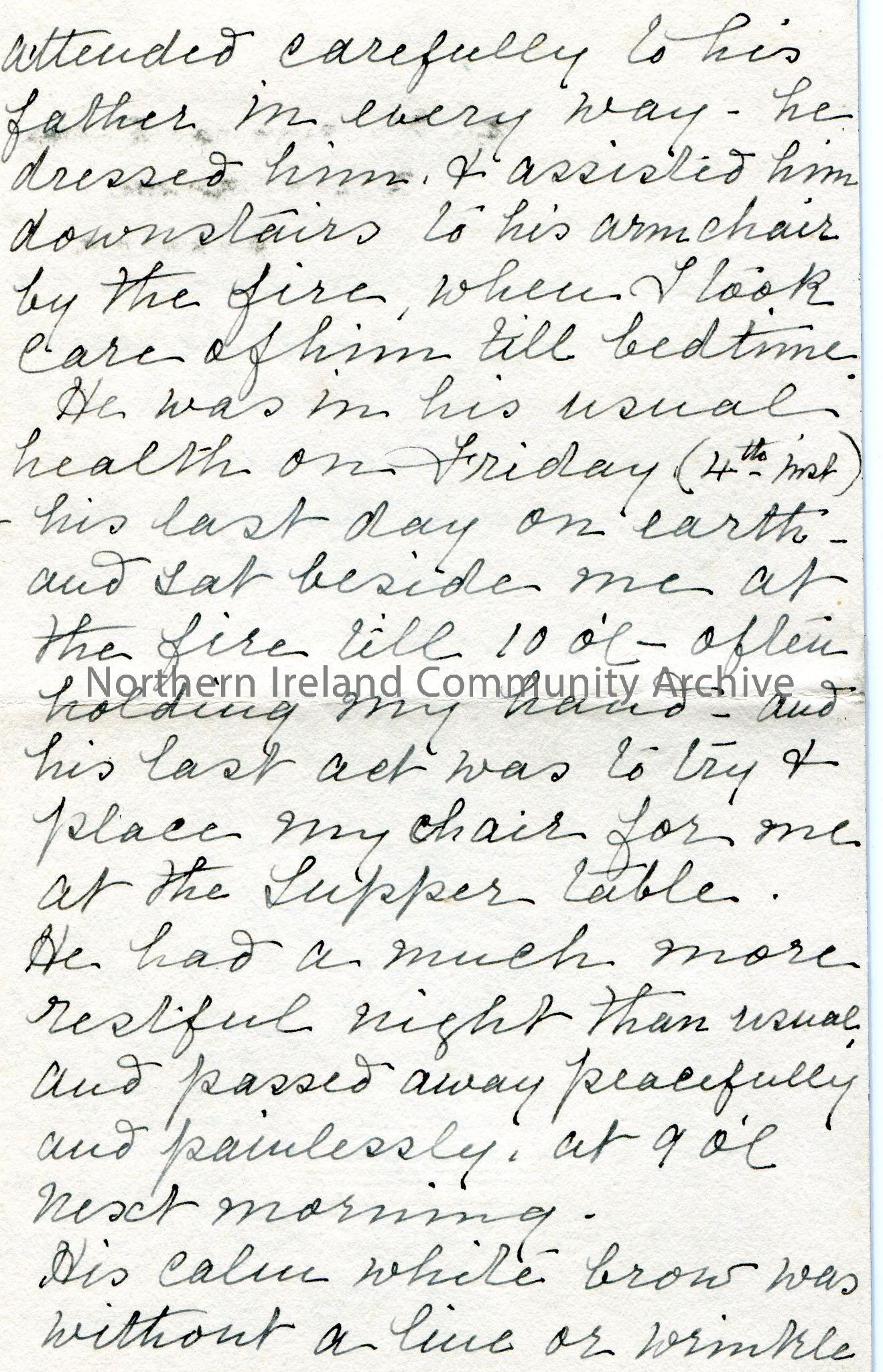 Page 1 of 2. Handwritten letter (black border for mourning, pages folded over) to Sam Henry. Letter of praise and thanks. Thanks Sam for his present which she values highly. Praises his poetry. She has sent a photograph of Sam's as well as verses to Canada, USA, Australia and Egypt. Recounts her husband's passing at their home. Writes how much her husband admired Sam. She is left with her son Bertie and daughter Helen.