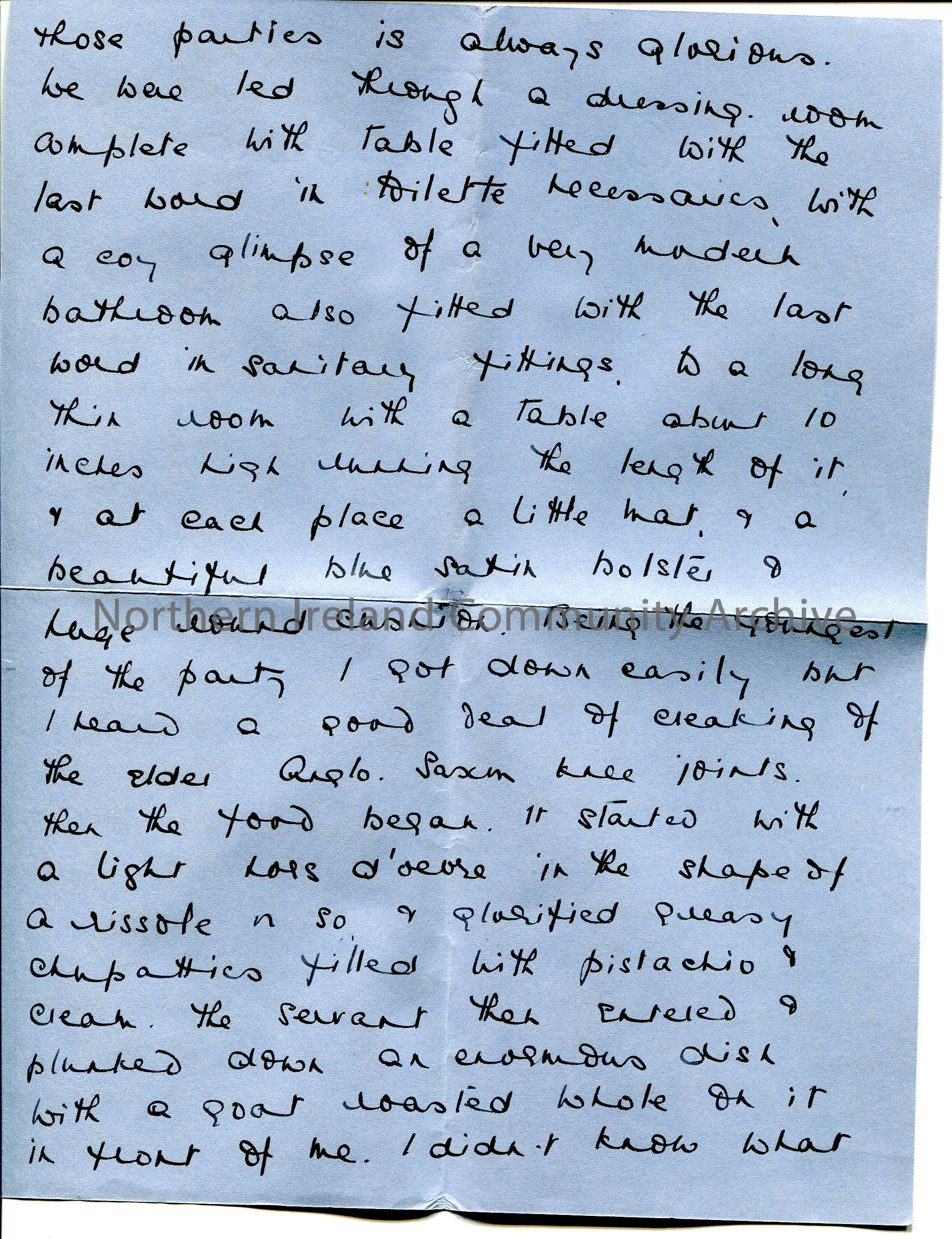 Page 1 of 2. Handwritten letter (double sided on blue paper) to ‘Mummy dearest’ [Mrs Hezlet]. She describes a night at dinner the previous evening wit… – scan153d