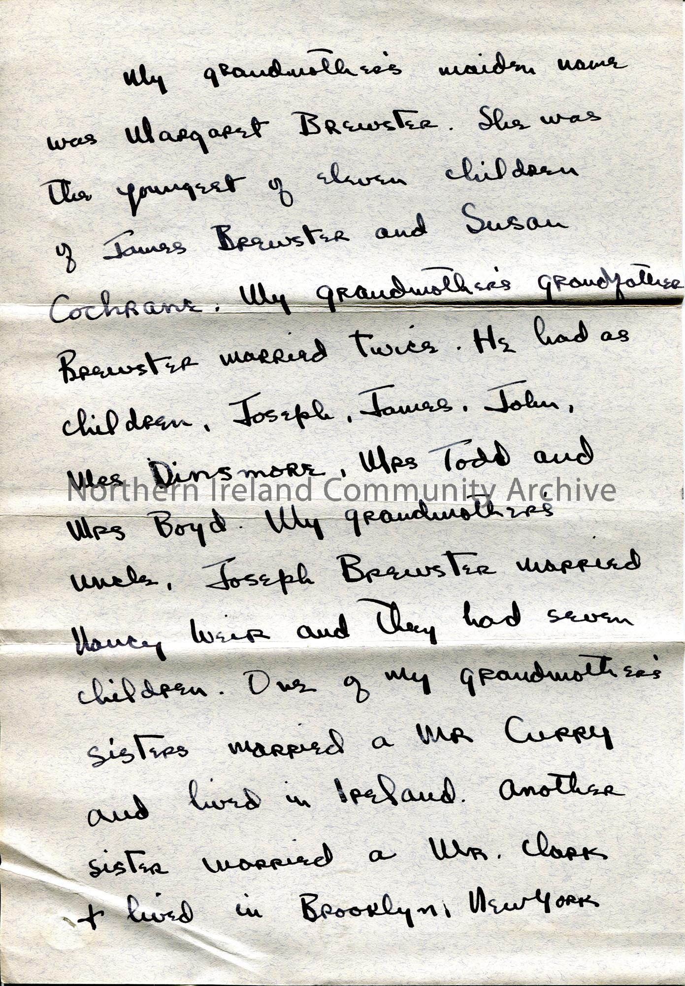 Page 1 of 2. Handwritten letter (double sided) to County Clerk of Coleraine from John Brewster. Requests help with his genealogical research into his grandmother's family history. Margaret Brewster was born in Coleraine in 1838 and moved to America as a child. Her parents were James Brewster and Susan Cochrane.