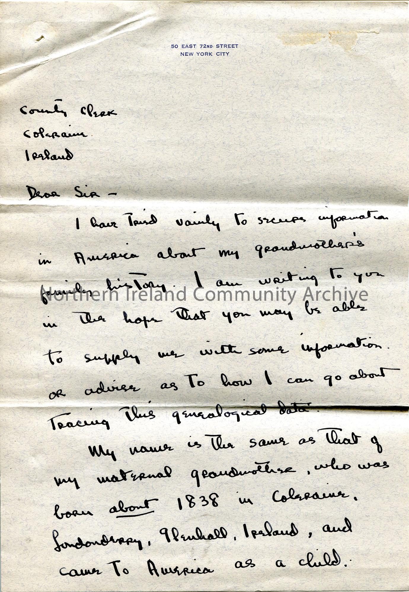 Page 1 of 2. Handwritten letter (double sided) to County Clerk of Coleraine from John Brewster. Requests help with his genealogical research into his grandmother's family history. Margaret Brewster was born in Coleraine in 1838 and moved to America as a child. Her parents were James Brewster and Susan Cochrane.