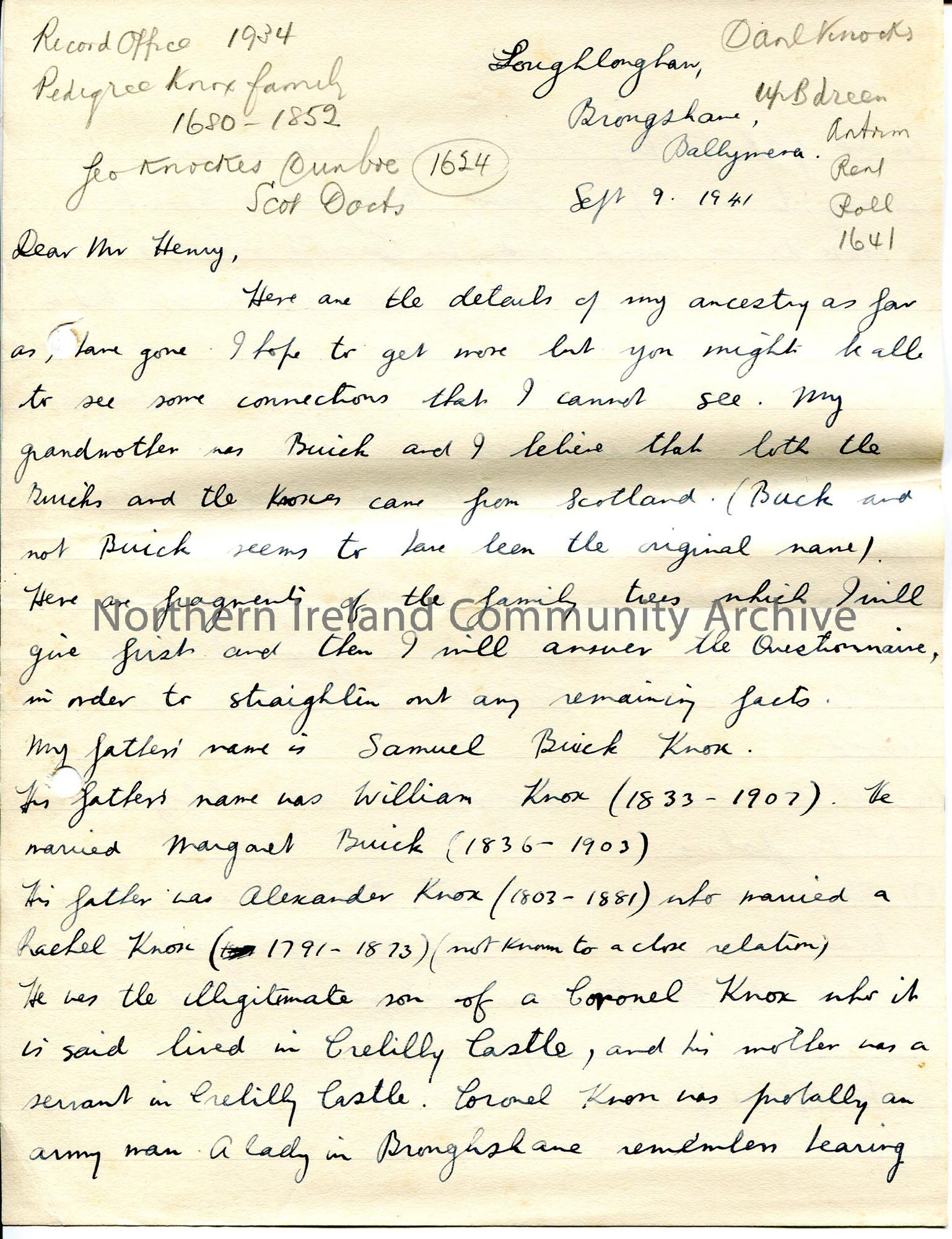 Page 1 of 2. Handwritten letter (double sided) to Mr Henry. Gives details of their ancestry - two sides - Knox and Buick. Also gives answers to Sam's genealogical questionnaire. Mentions Crebilly Castle and Broughshane. Gives regards to Mrs Henry and Olive. Handwritten notes by Sam Henry in pencil on top of first page of letter re Knox family records.