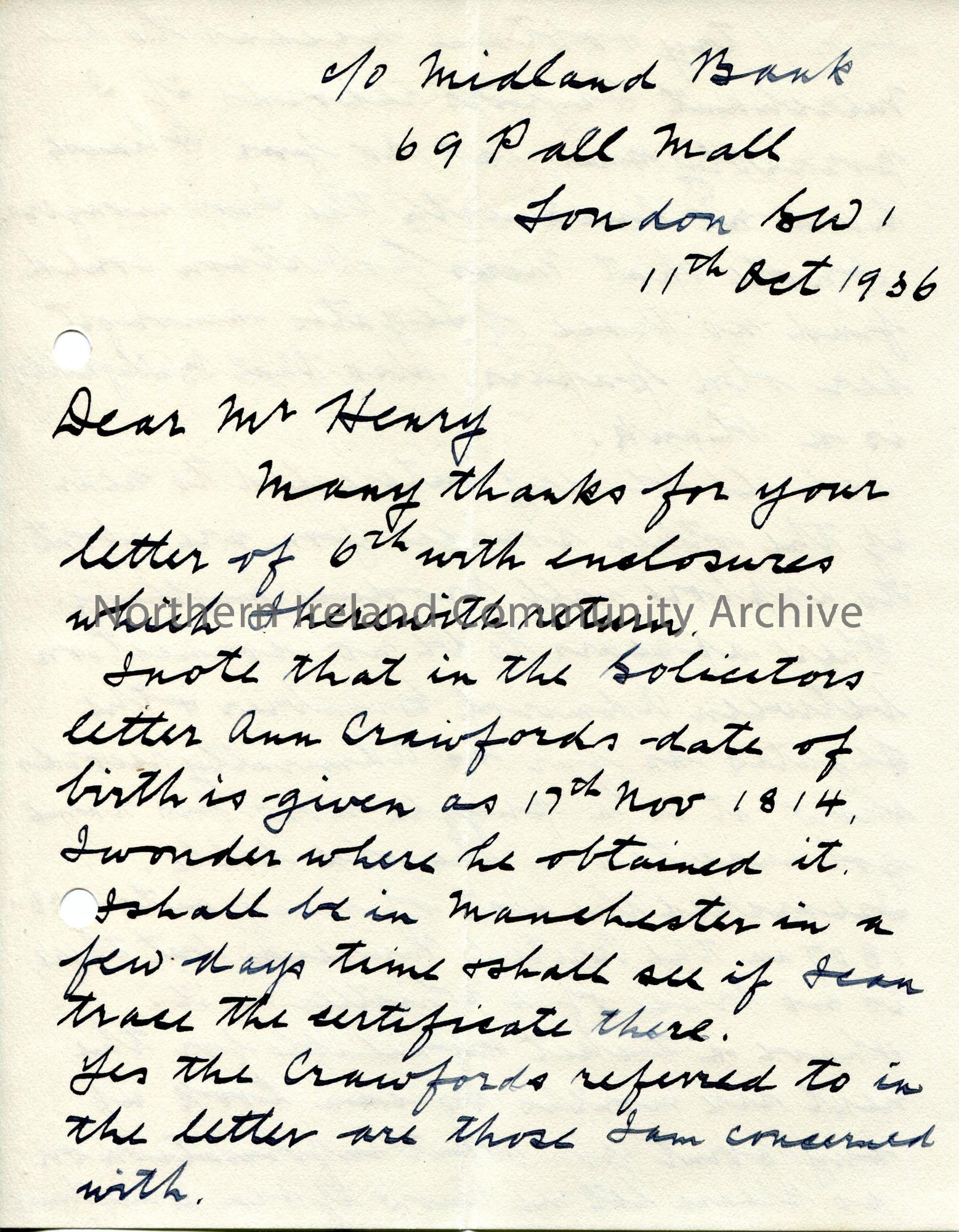Page 1 of 2. Handwritten letter (double sided) to Sam Henry from G W Bodell. Replying to a letter from Sam of 6th October. Re genealogy search of surnames Legate and Crawford. They searched passenger lists in the British Museum for Sam for name John Whistler but found nothing.