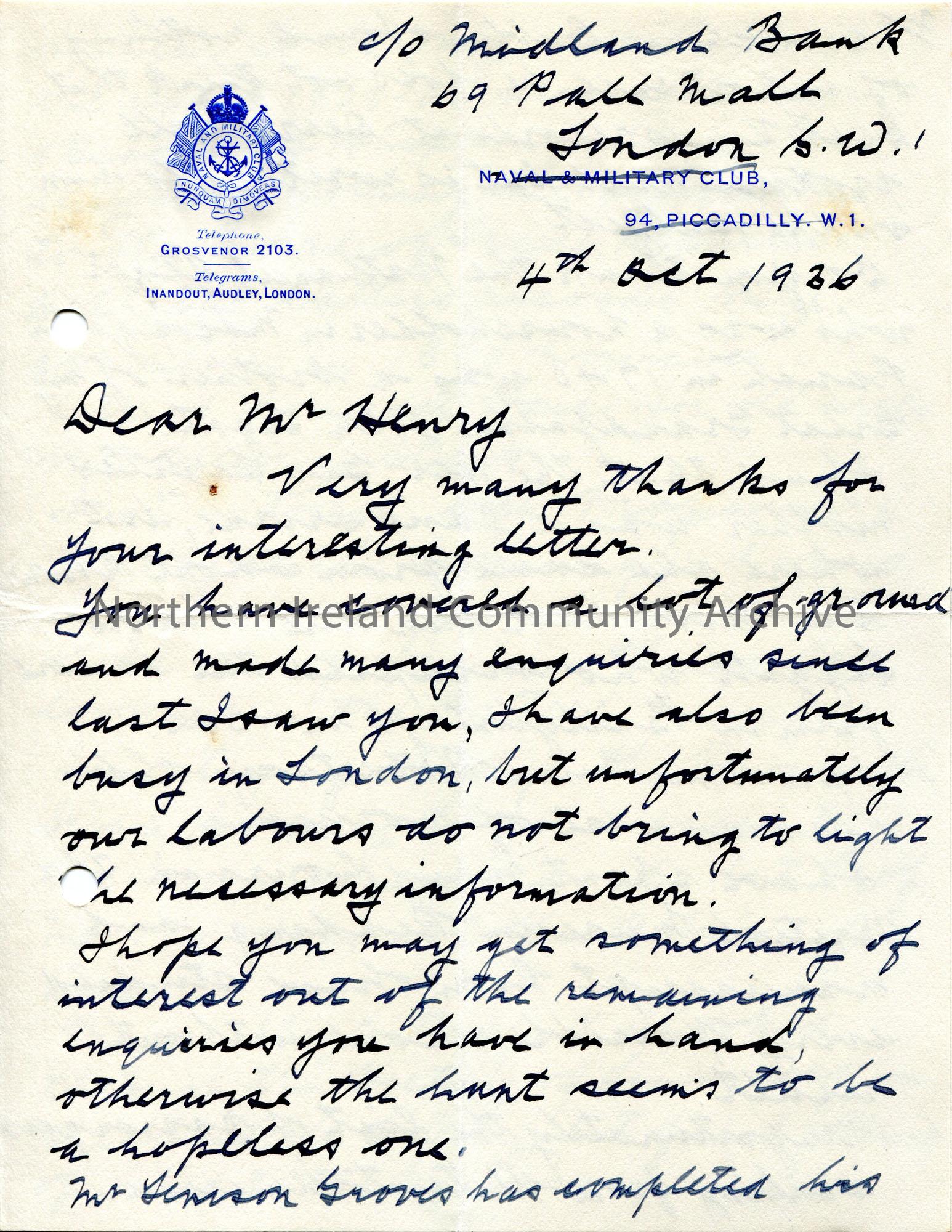 Page 1 of 2. Handwritten letter (double sided) to Sam Henry from G W Bodell. Thanks Sam for his research into the surname Ligat / Legate. They will visit the British Museum to check passenger lists as requested by Sam in a previous letter (see below).