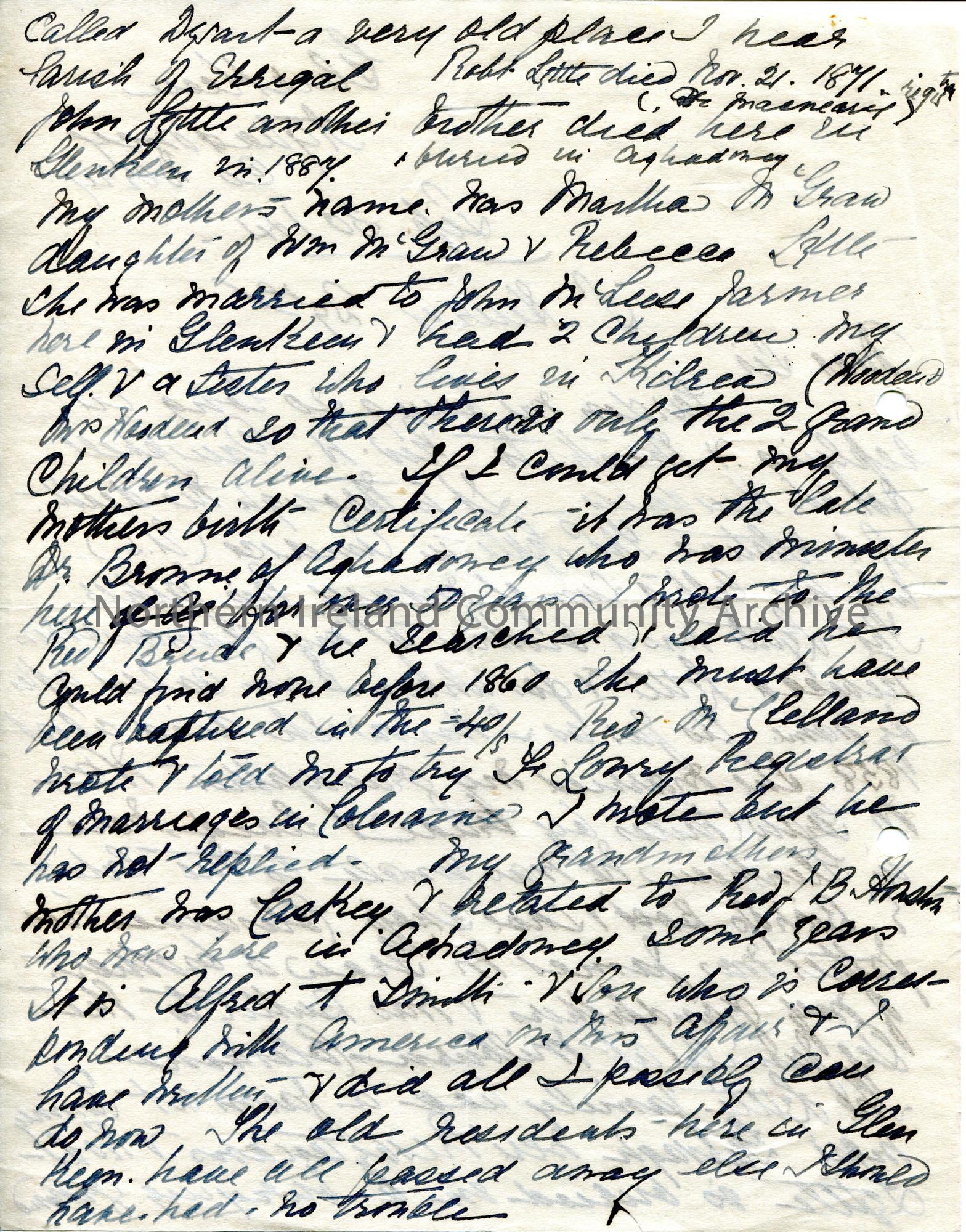 Page 1 of 2. Handwritten letter (double sided) to Sam Henry from Mrs Rebecca Wright. Re genealogy research. Asks Sam to locate her mother's Baptismal record, Martha McGraw. Refers to relatives with surname Lyttle. Recalls relatives of surname McGraw having worked for Bishops Shoe shop, Coleraine and butler to the Orr family at Millburn, Coleraine.