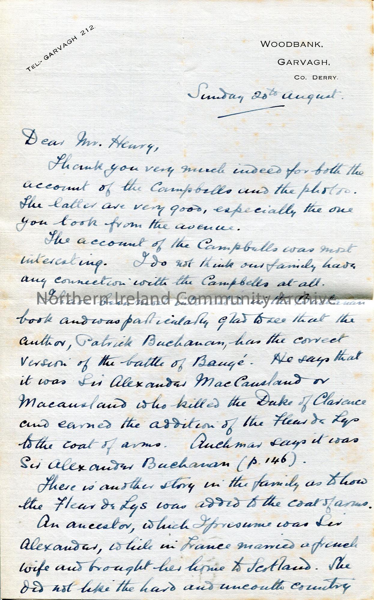 Page 1 of 2. Handwritten letter (double sided) to Sam Henry from R A Macausland. Thanks Sam for sending Campbell article and photographs. Writes of his interest in the Buchanan book; how he believes the Fleur de Lys was added to the Coat of Arms; re his Uncle Oliver; recounts a day in the Tyrone mountains looking for rare plants with Dr Praeger and Sir Henry Tyler; hopes to meet up with Sam on a trip of Swatragh and Maghera.