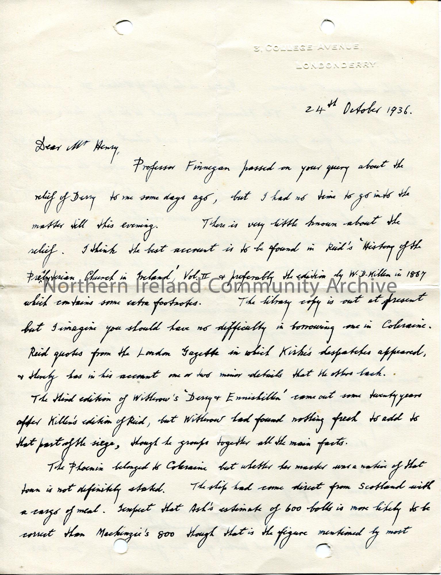 Page 1 of 2. Handwritten letter (double sided) to Sam Henry. Responding to Sam’s query re the relief of Derry. Mentions the ship ‘The Phoenix’ as belo…