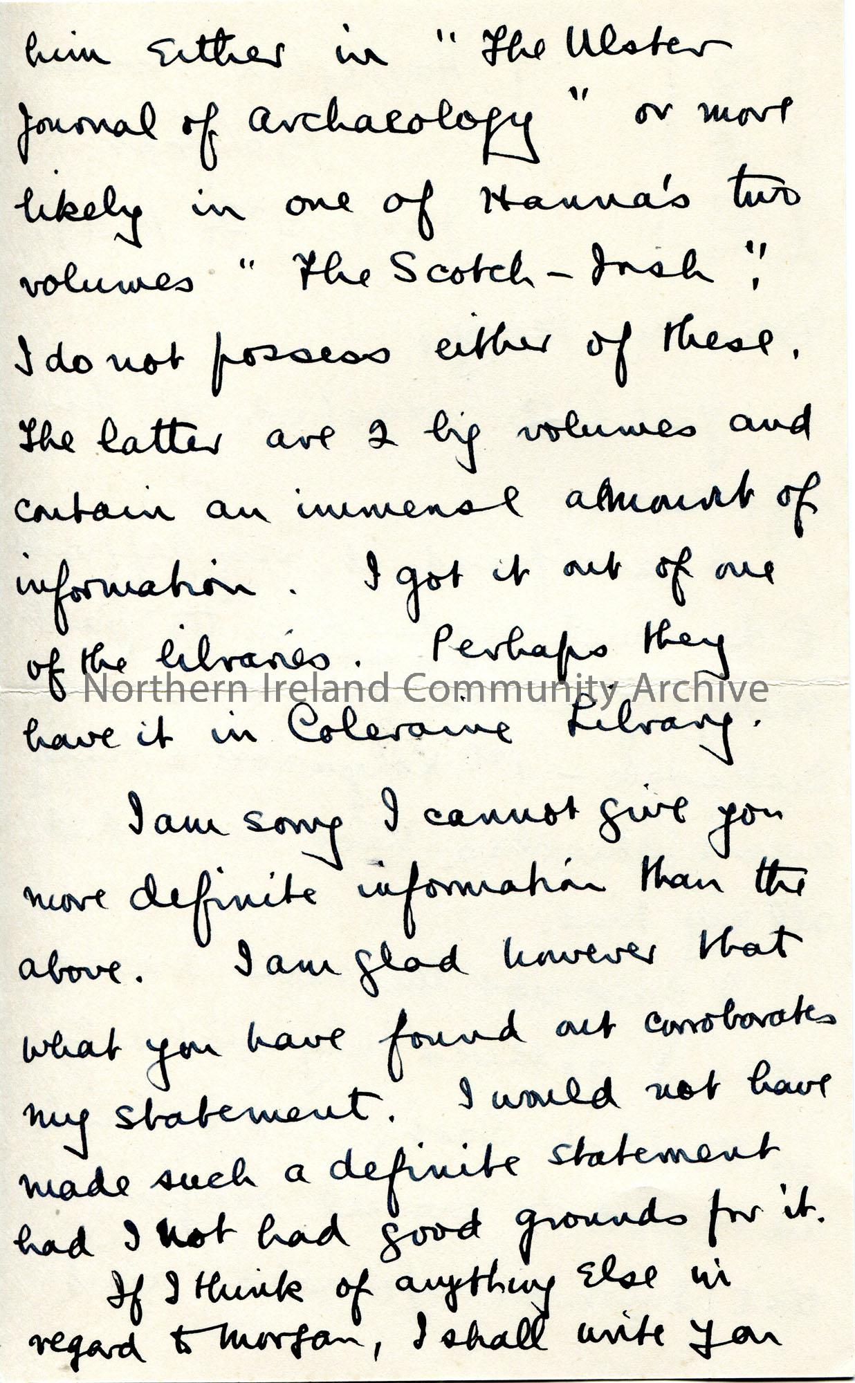 Page 1 of 2. Handwritten letter (double sided) to Sam Henry. Writing re Sam's request for information re Daniel Morgan. Writes they have had little time to read due to Church work. Recommends looking in 'The Ulster Journal of Archaeology' or Hanna's volumes 'The Scotch-Irish'. Quotes from a lecture by Whitelaw Reid in Belfast, 1912 'The Scot in America & the Ulster Scot' re General Morgan.