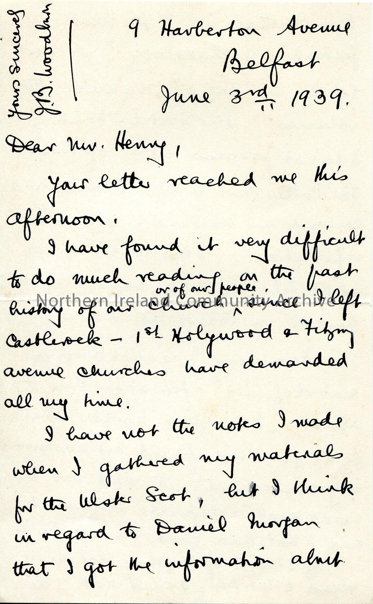 Page 1 of 2. Handwritten letter (double sided) to Sam Henry. Writing re Sam's request for information re Daniel Morgan. Writes they have had little time to read due to Church work. Recommends looking in 'The Ulster Journal of Archaeology' or Hanna's volumes 'The Scotch-Irish'. Quotes from a lecture by Whitelaw Reid in Belfast, 1912 'The Scot in America & the Ulster Scot' re General Morgan.