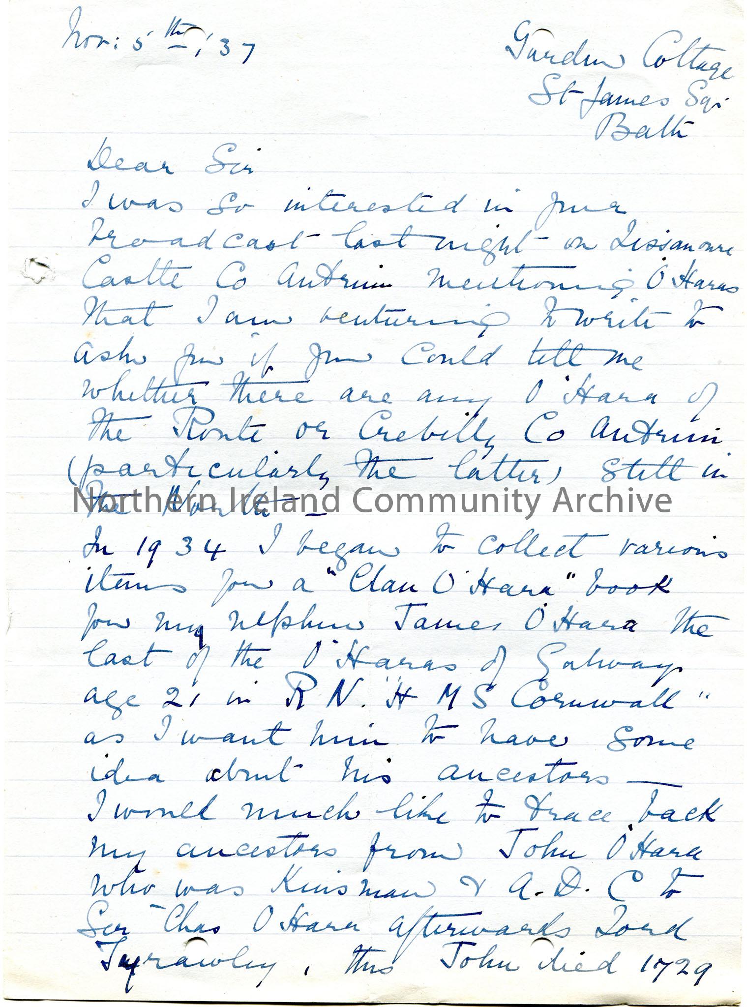 Page 1 of 2 handwritten letter. First page double sided. From Rose O'Hara, Garden Cottage, St James Square, Bath. Dated 5th November, 1937. Interested in a broadcast re Lissanoure Castle, Co. Antrim and its O'Hara connection. Asks for information re the O'Haras of Runte? or Crebilly, Co. Antrim. Rose is collecting items for a "Clan O'Hara" book for her nephew James O'Hara, the last of the O'Hara's of Galway, aged 21 on R.N 'H.M.S Cornwall'. She also wants help to trace the ancestory of the O'Haras of Co. Sligo.