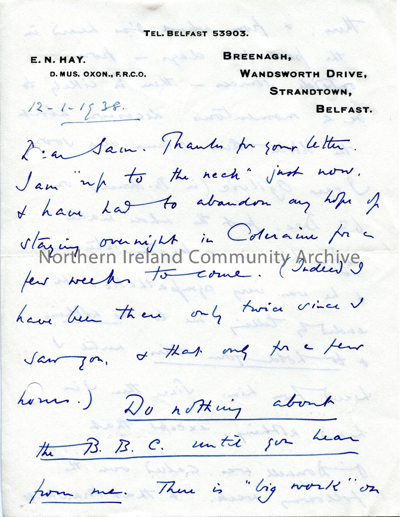 Page 1 of 2. Handwritten letter (first page double sided) to Sam Henry. Asks Sam to do nothing about the BBC until he gets back to him [this is underl…