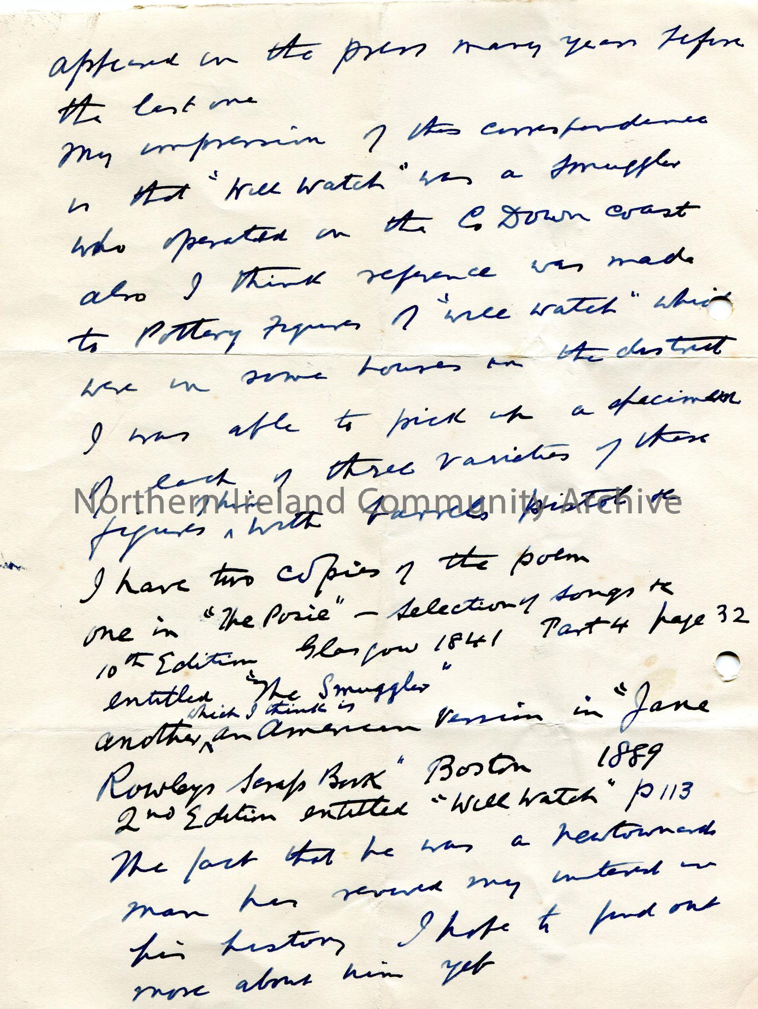 Page 1 of 2 handwritten letter, first page double sided, to Sam Henry. Thanks Sam for replying and for sending sea songs. Also thanks him for information re Will Watch. Got a copy of Mr and Mrs Halls tour in Iceland. Refers to correspondence in a local Belfast paper re Will Watch and a second paper which included a poem on the subject. Talks of Will Watch and pottery figures relating to him. Refers to two possible locations of the poem. Discusses research into the pedigree of President Andrew Jackson.