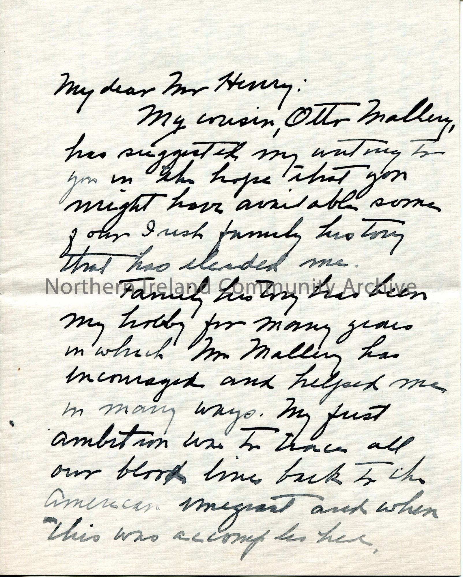 Page 1 of 2. Handwritten letter (folded and written on 4 sides) to Sam Henry from James E Gibson. Believes they have ancestral links in Buncrana, Co. …