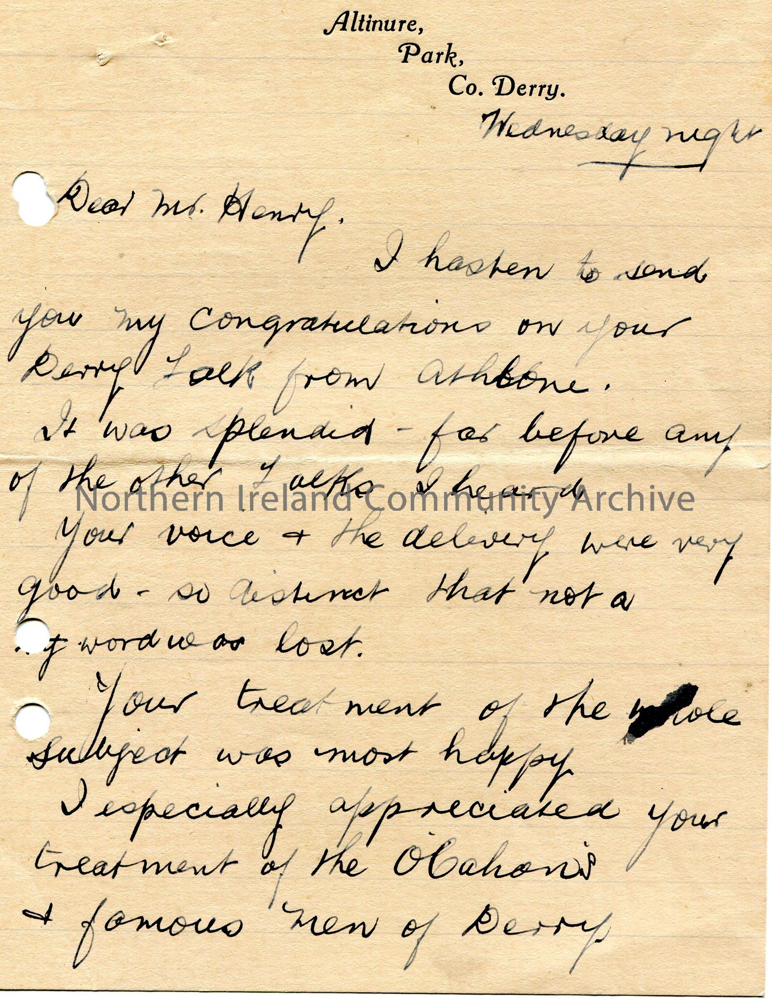 Page 1 of 2. Handwritten letter from Pat Conway to Sam Henry congratulating him on his Derry talk from Athlone.