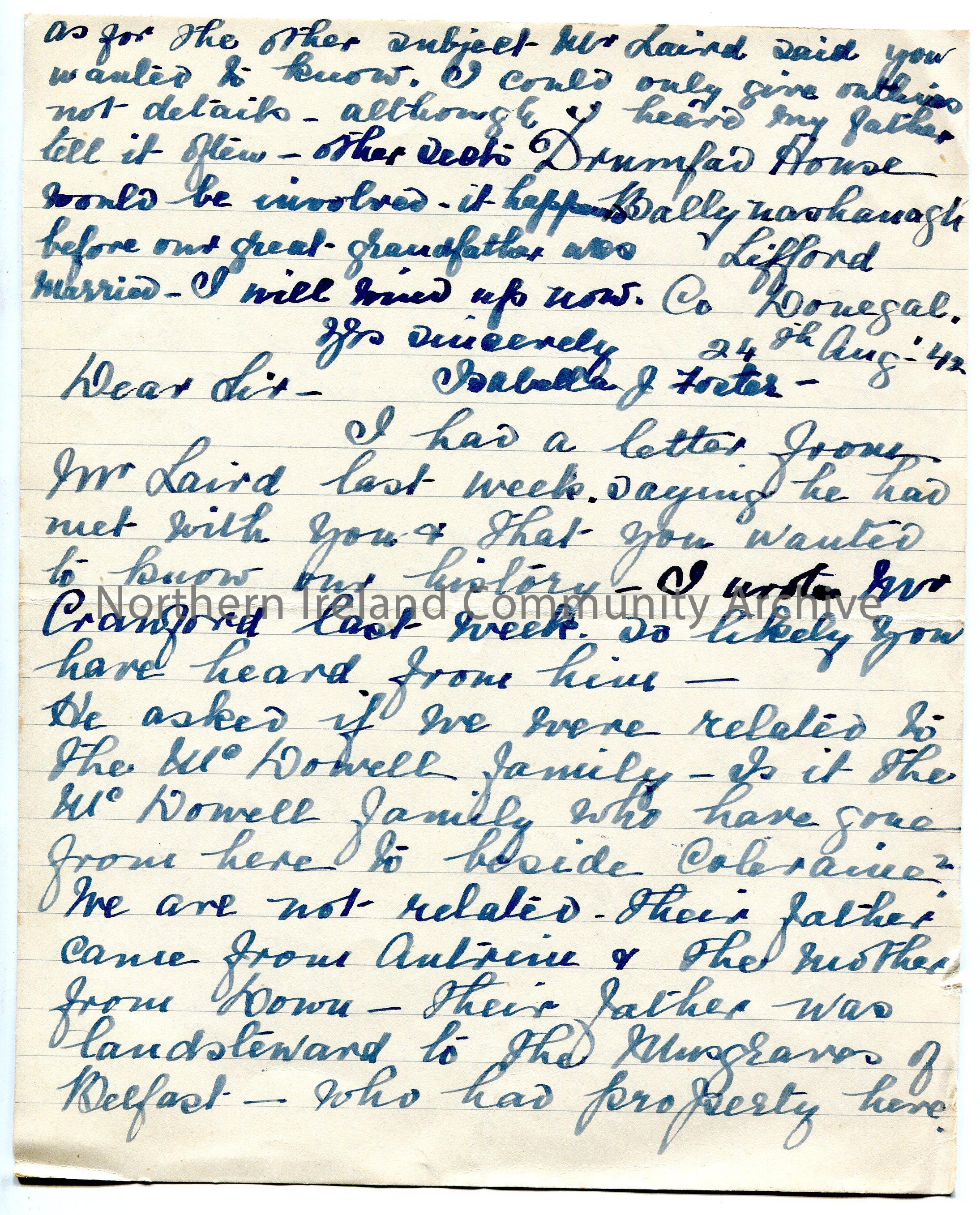 Page 1 of 2. Handwritten letter on lined paper to ‘Dear Sir’. Provides Sam with genealogical information re their family name of Foster.