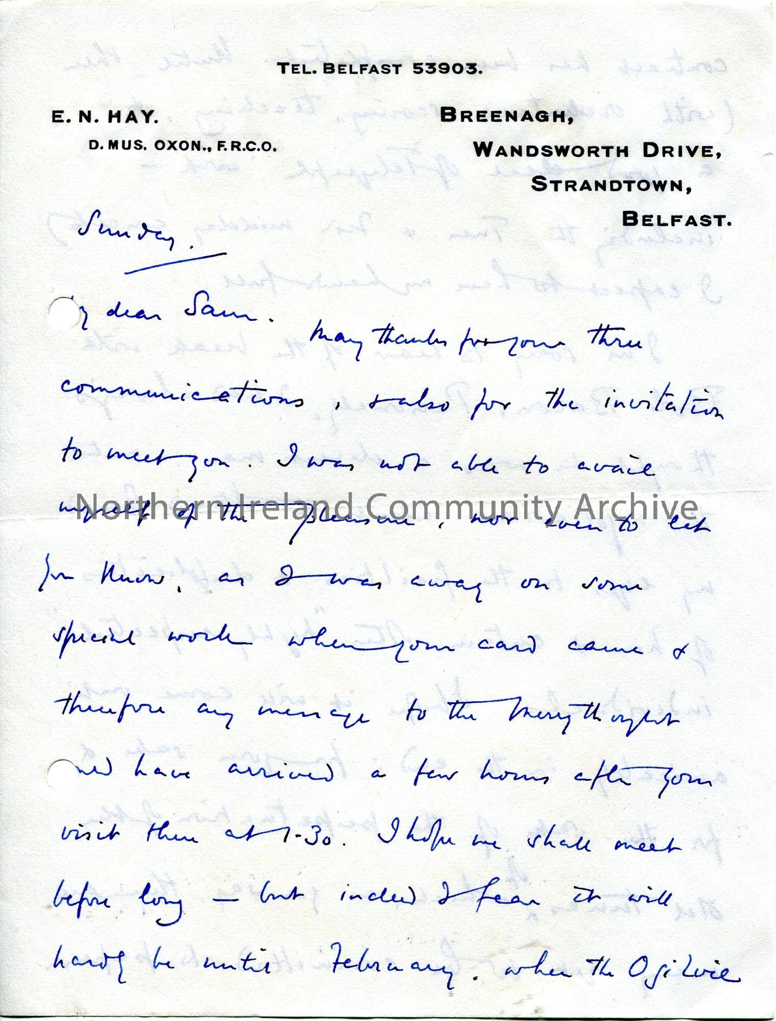 Page 1 of 2. Handwritten letter (pages double sided) to Sam Henry. Writes that he is sorry to hear of the 'break with Bob Bacon' and Sam. Writes of a matter concerning airs and contributors which Sam appears to have doubts over.
