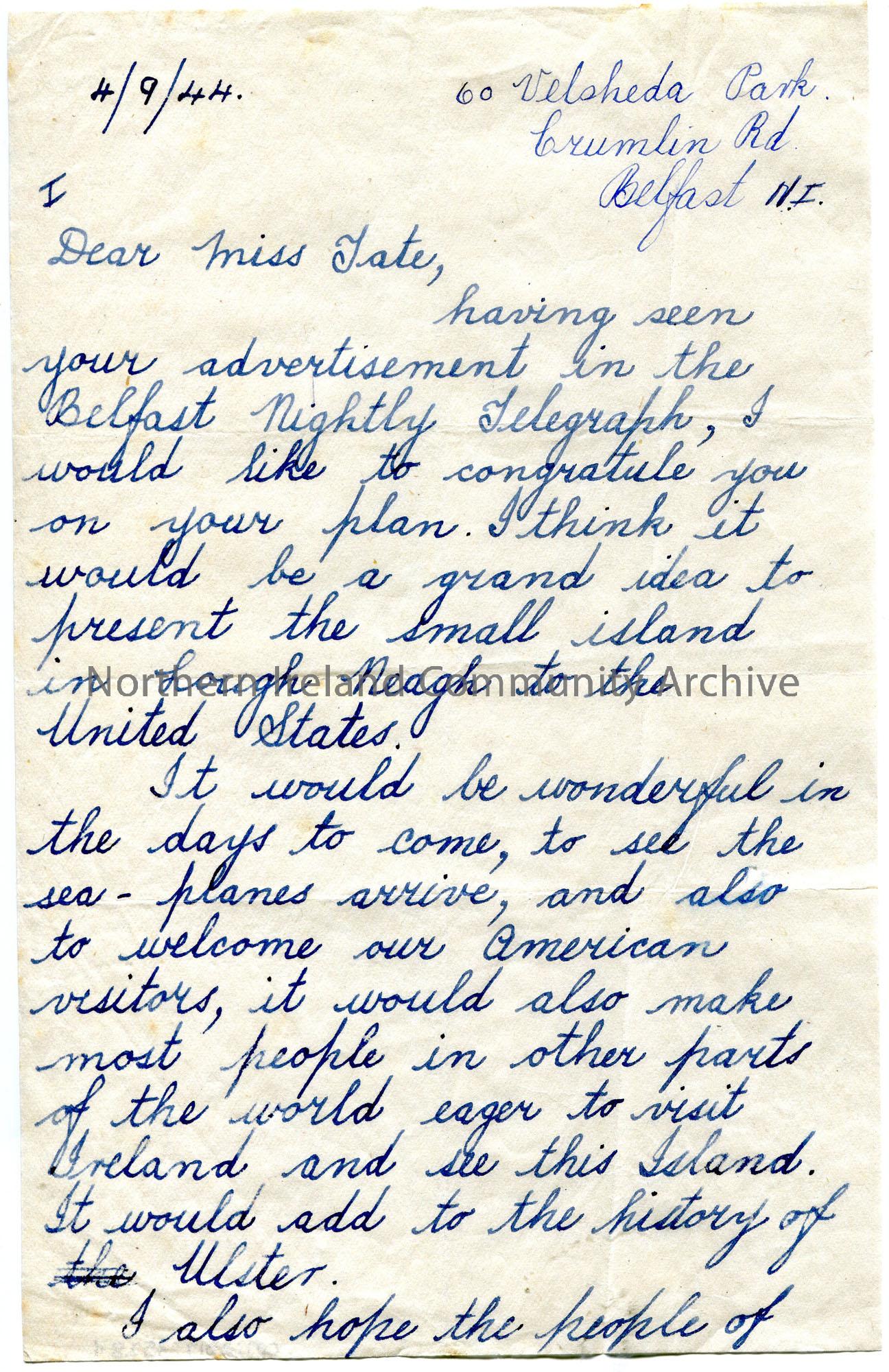 Page 1 of 2. Handwritten letter to Miss Tate. Thinks her idea of presenting Coney Island, Lough Neagh, to the U.S.A. is a good idea and asks for more information. Handwritten note at bottom of letter, most likely to Sam, re meeting the author of the letter.