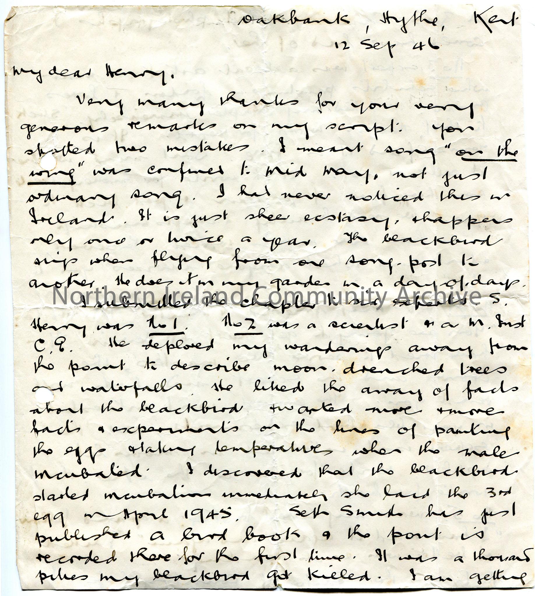 Page 1 of 2. Handwritten letter to ‘My dear Henry’. Had sent Sam a chapter, possibly for a book to be published, and to 5 other ‘experts’ to read. Boo…