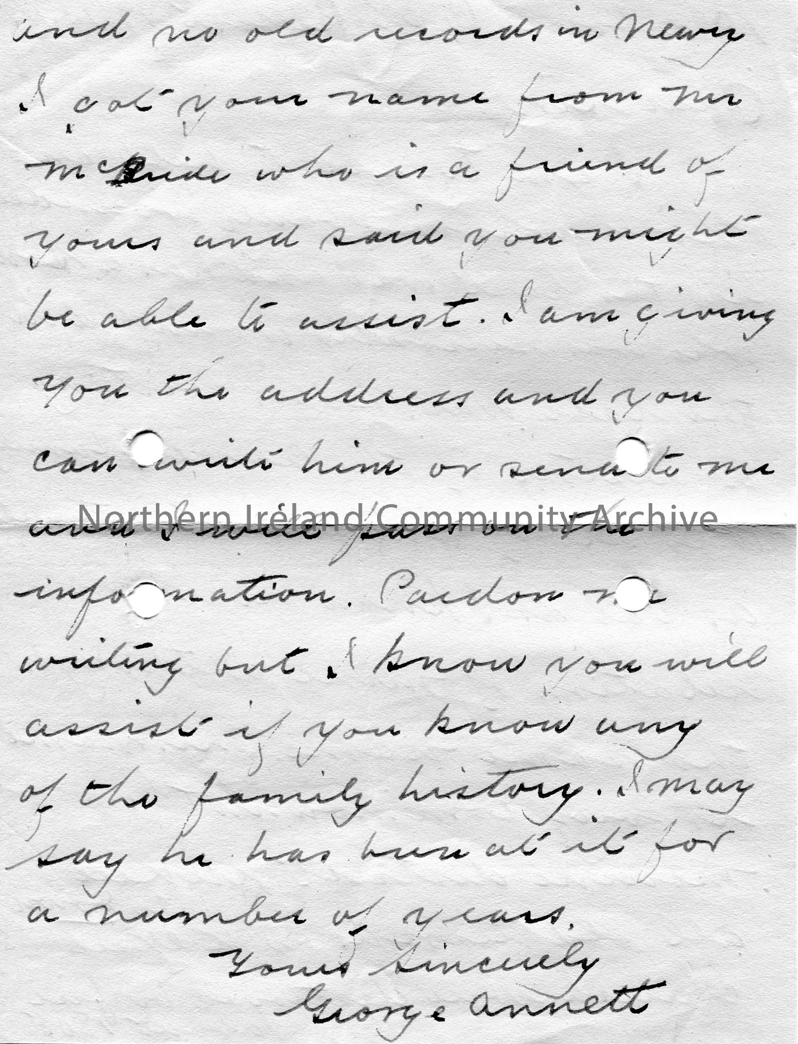 Page 1 of 2. Handwritten letter to Sam Henry. Addressed to 'Dear Sir'. Writing for genealogical information re the Annett family for an officer who was wounded in World War I. Mentions the Kilkeel and Newry areas. Claims it is no relation to himself. He was given Sam's name from Mr McBride, a friend of Sam's. Encloses the Annett's address and believes that Sam will be able to assist.