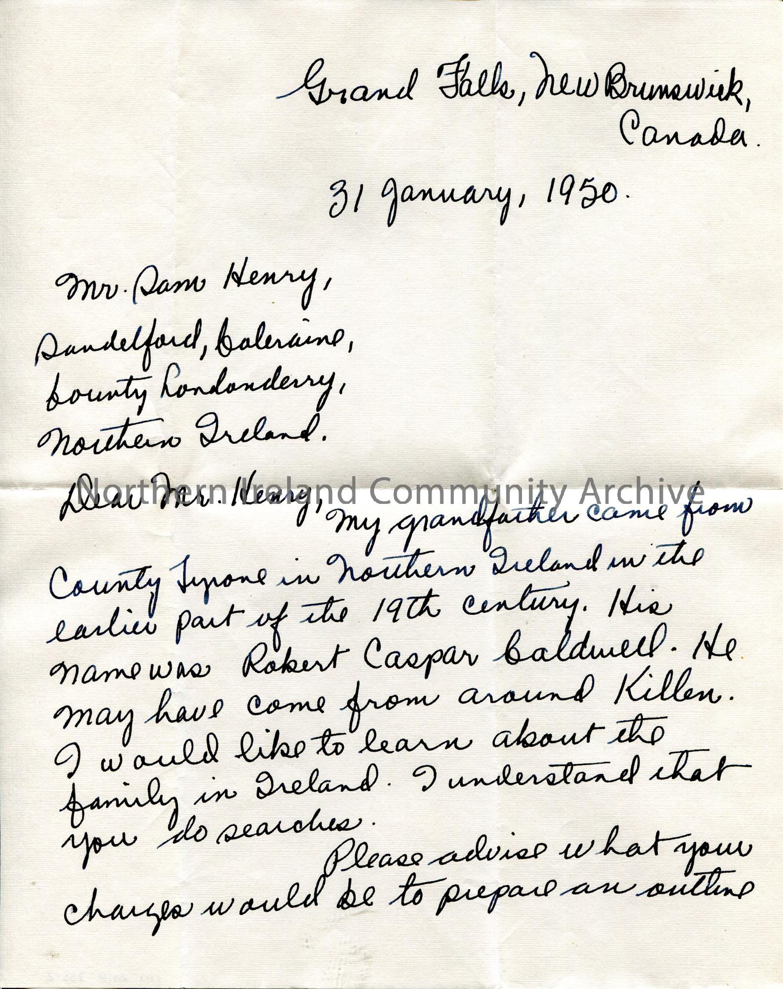 Page 1 of 2. Handwritten letter to Sam Henry. Asks for Sam's help to search for genealogical information re their grandfather Robert Caspar Caldwell who came from County Tyrone and moved to New Brunswick, Grand Falls, Canada.