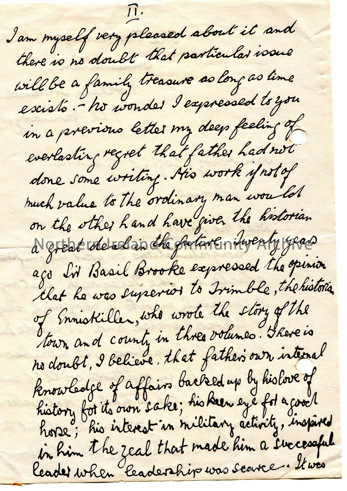 Page 1 of 2. Handwritten letter to Sam Henry. Congratulates Sam on his 'magnificent' article in 'The Telegraph'. Gives it praise and has been received well. Writes of his father being a 'successful leader'. Glad Sam was able to develop the 'Washington Arms' in 'old glory'. Refers to the poet Virgil and his 'Aeneid' which begins with 'Arma Virumque Cano'. Mentions the Library of Congress and Sam's contact with them re 'The Star Spangled Banner'. Discusses getting a 'truer' portrait of his father. Asks if Sam has heard from Major Vaughan and if he is aware of the link between the Buchanans of Edenfel and a President of America. Mentions Mollie Buchanan is a sister of Mrs Hammond-Smith and is Junior Commander of the A.I.S. at Omagh. Sam to let him know how the 'matter' works out on 'this side of the Atlantic' and in America. Mentions a connections of the Washingtons and Churchills in the 'Illustrated London news'. Mentions Sir Basil Brooke.