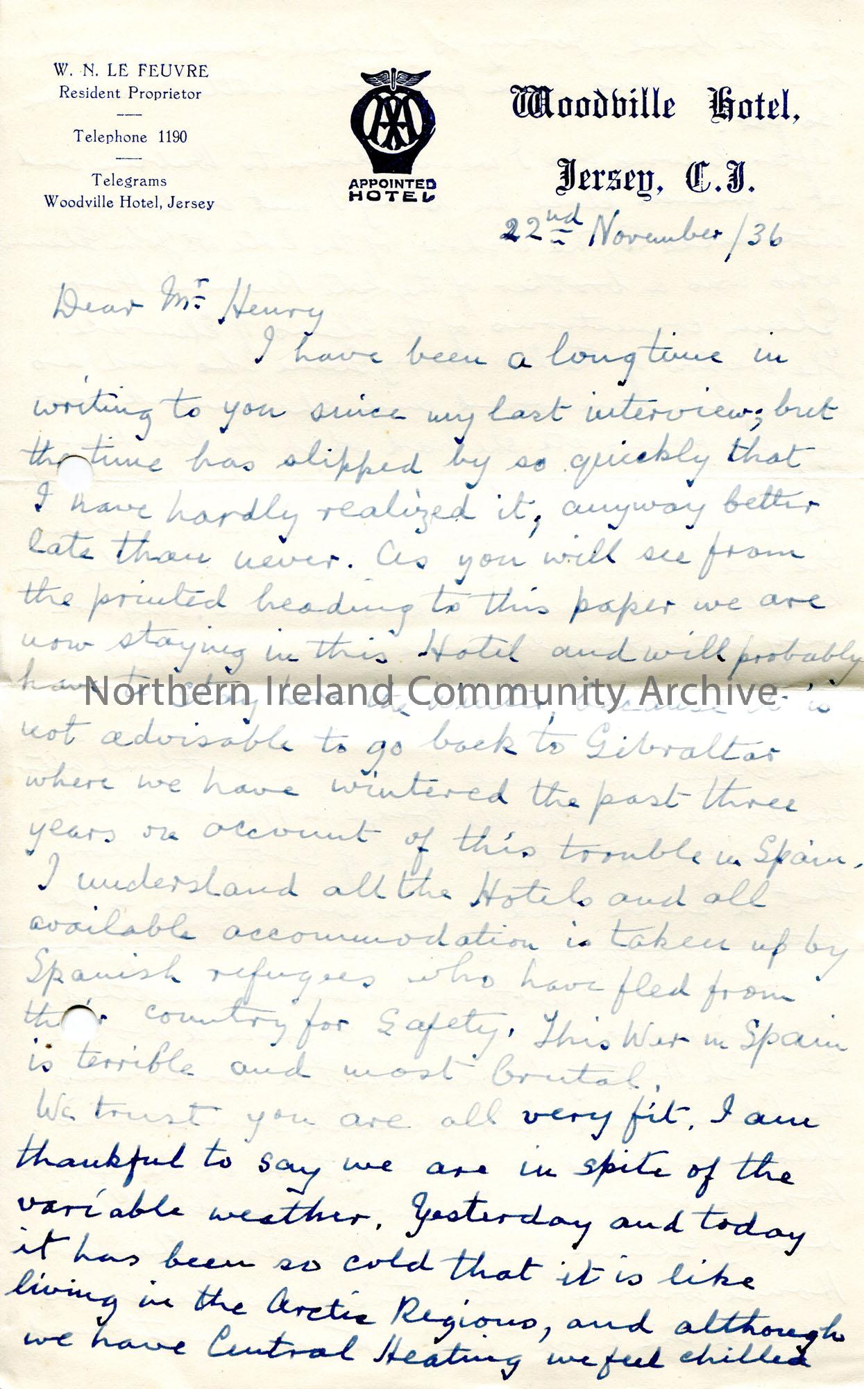 Page 1 of 2. Handwritten letter to Sam Henry from H Glenn. Notes his inability to go back to Gibraltar due to unrest in Spain. Updates Sam on his fami…
